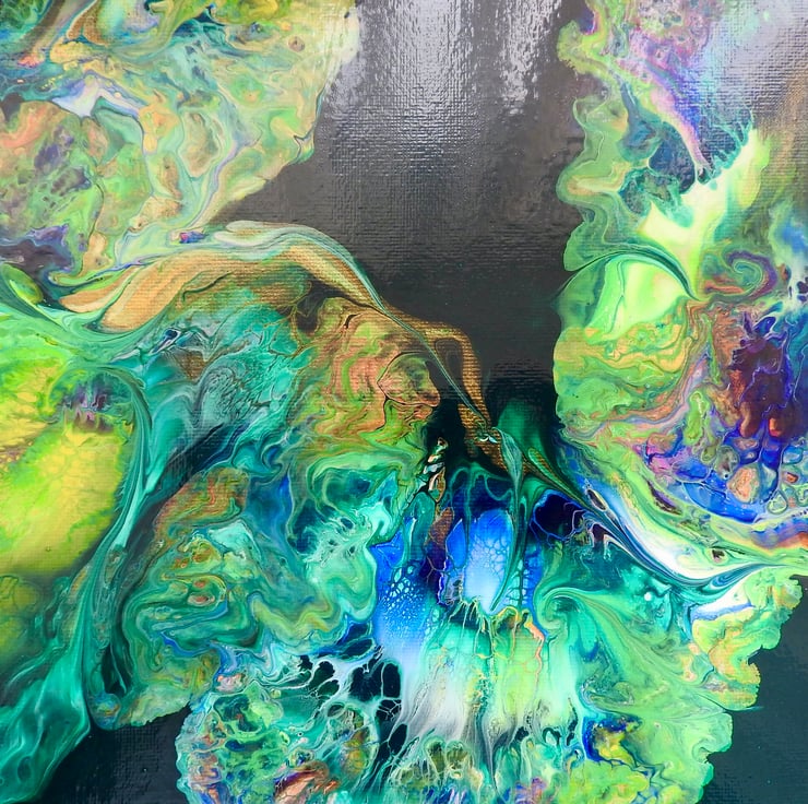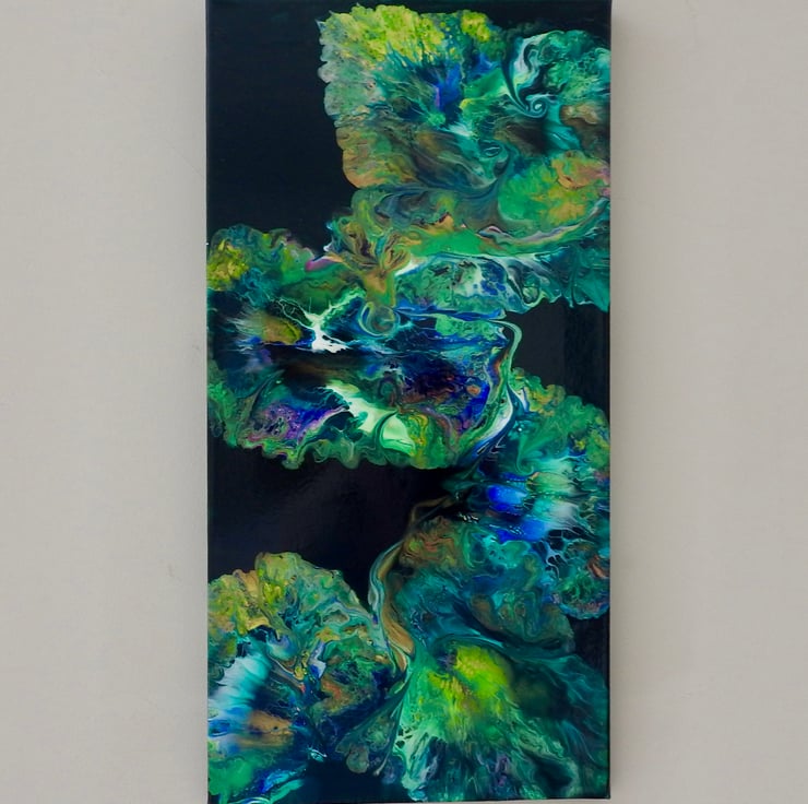 The green and gold tones in my garden inspired this striking piece the flow of the paint and the cells interacting with each other make fabulous patterns .