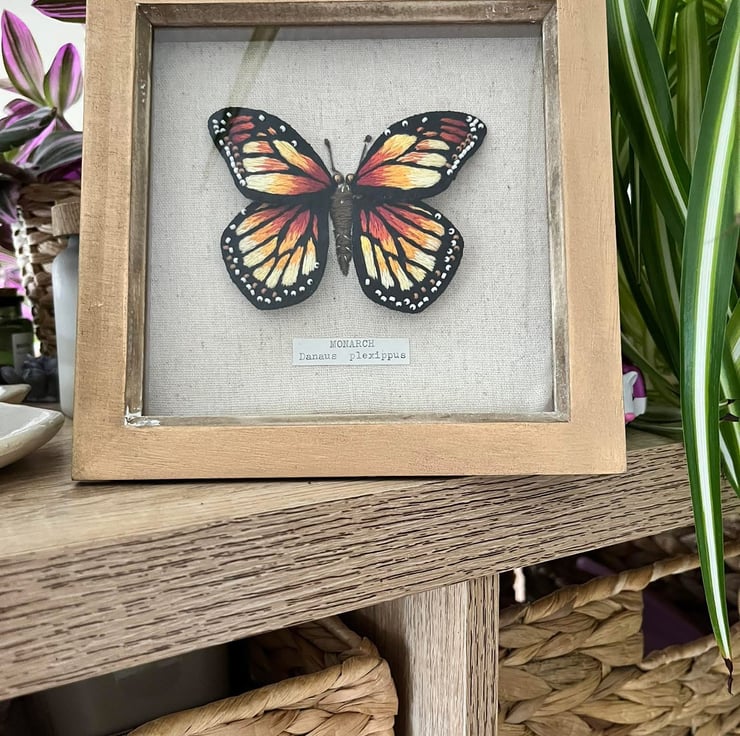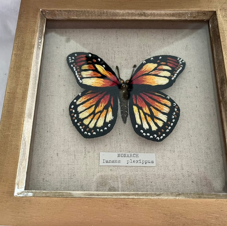 A 3d stump work embroidery of a monarch butterfly. The butterfly measures approximately 4.5” by 3.5” and the frame measures 7.5” by 7.5”. Thank you for looking at my work. It took about 4 weeks in small bursts to make this x