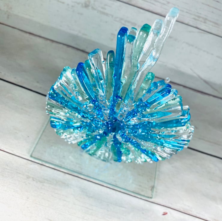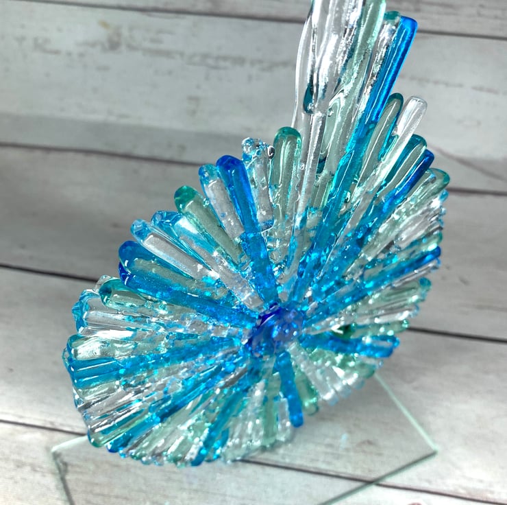 These gorgeous textural fused glass ammonites stand on a clear glassbase. They are approximately 7 inches tall and due to the way they are made they catch the light beautifully . The glass is first cut into lots of slim strips then laid on a kiln shelf and fused for 48hrs . They are then cold fused to the glass base. A beautiful sculpture for any room in your home or to gift .