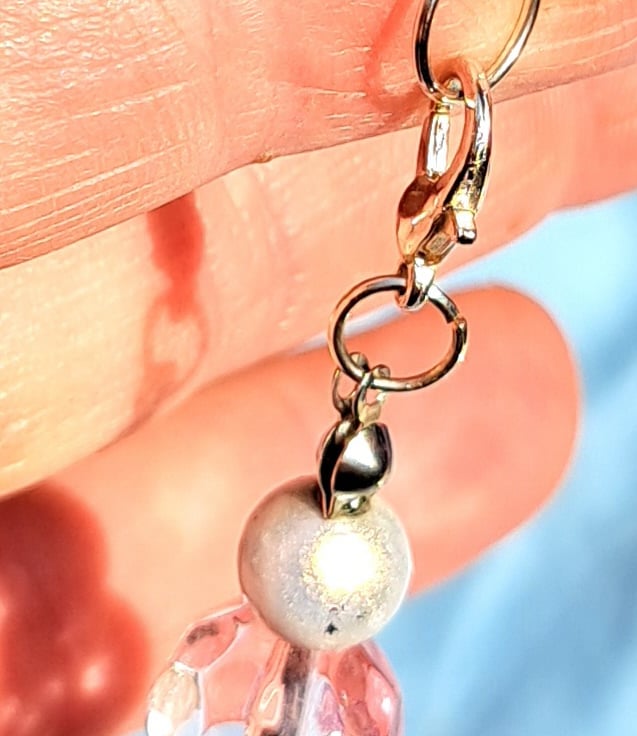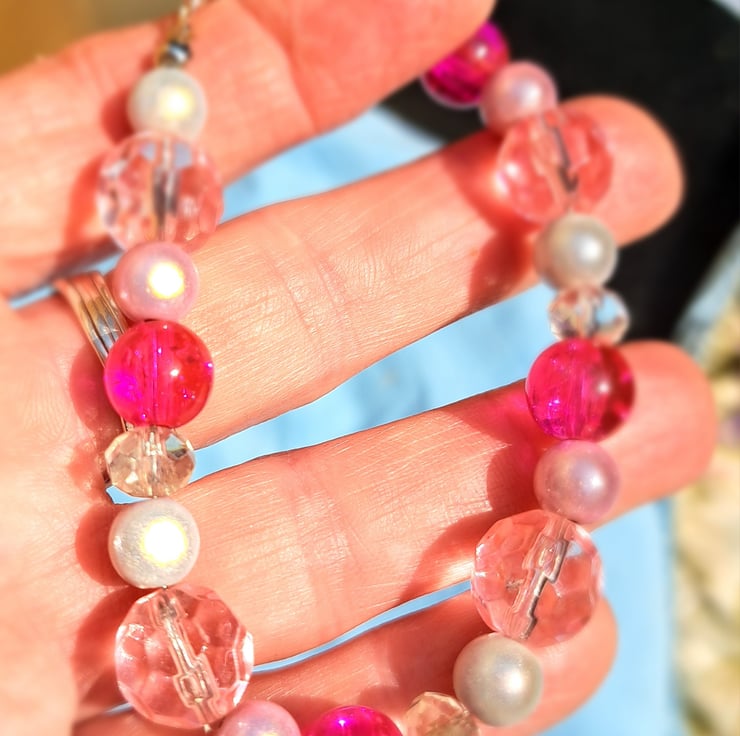 Pink and white crystals and pink and white disco beads on a wire secured with a lobster clasp.