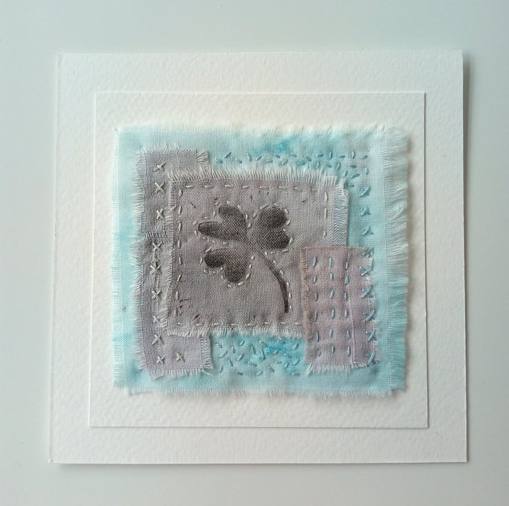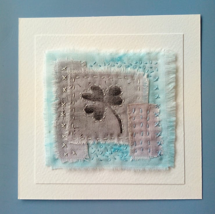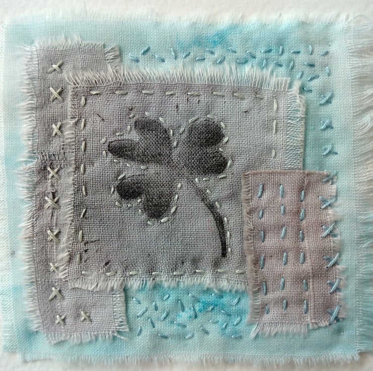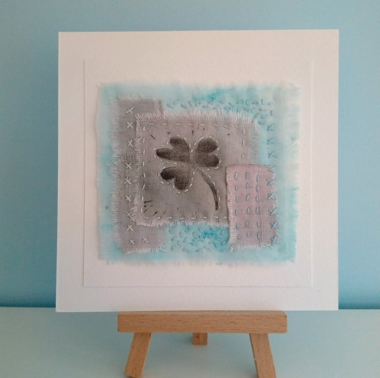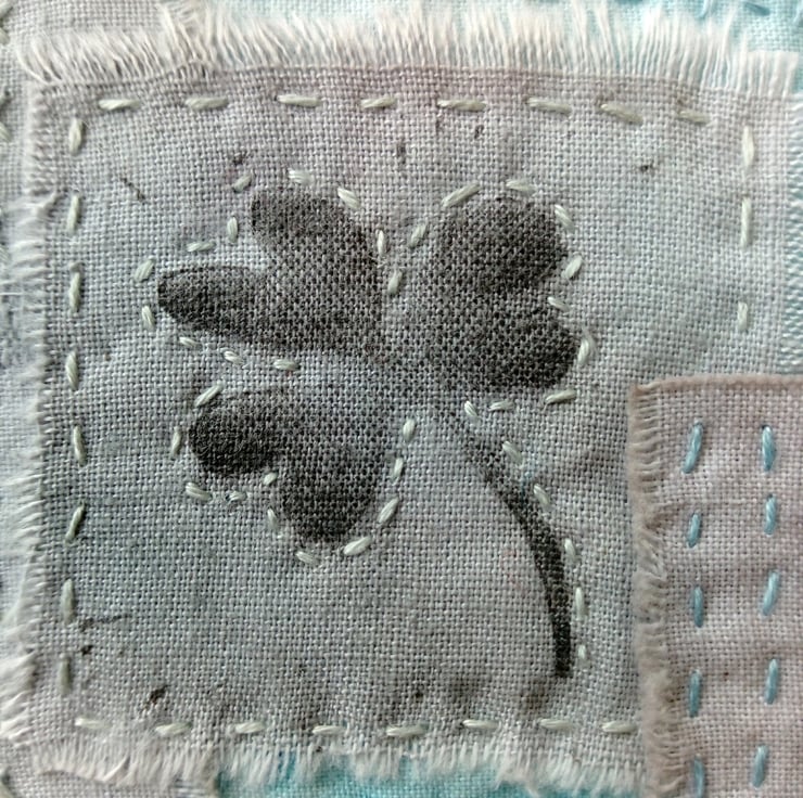 An original piece of mixed media textile art, featuring my own lino printed clover leaf design on an embroidered textile collage.