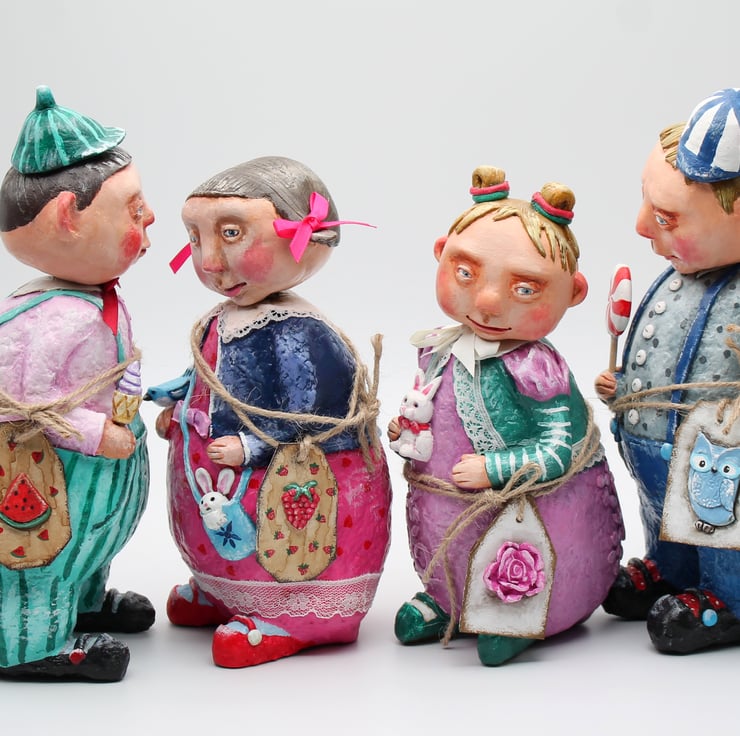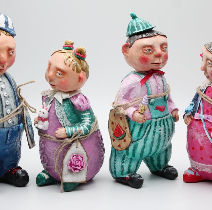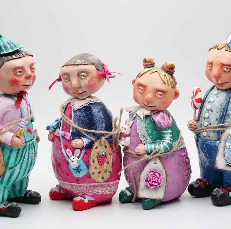 Lovingly sculpted from paper clay and carefully painted by hand, these whimsical companions are full of personality and charm. Their vintage-inspired clothes, soft colours, and curious gazes evoke a sense of nostalgia and gentle, childlike dreams.
