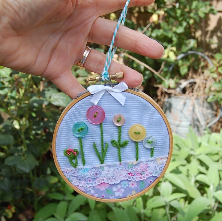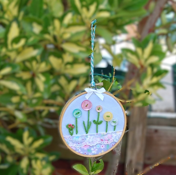 Light blue lightly striped fabric, pale lilac floral pattern cotton fabric trimmed with a piece of vintage lace set off these pretty hand embroidered button flowers. Placed in a bamboo hoop and backed with pale blue felt. A white and blue hanger and a little white bow complete this pretty hoop for hanging - from a door or drawer handle, or as a small wall hanging to bring a little cheerfulness to any space.