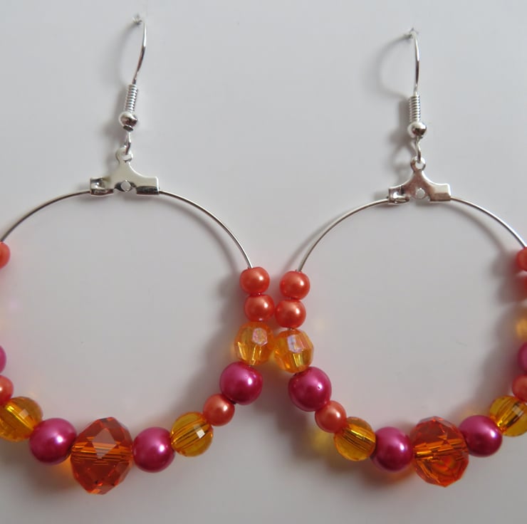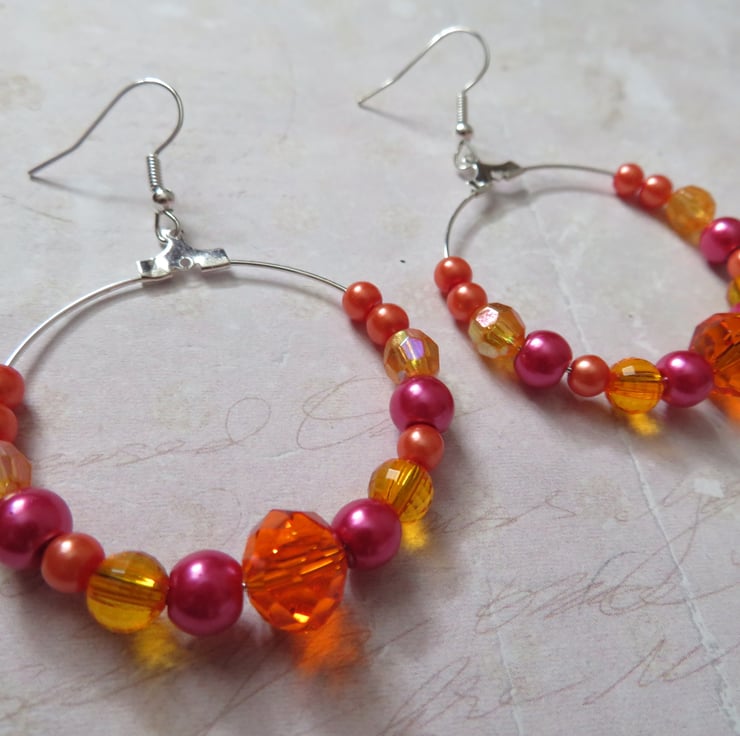 Orange Pink & Silver Beaded Retro Hoop Earrings