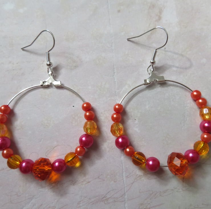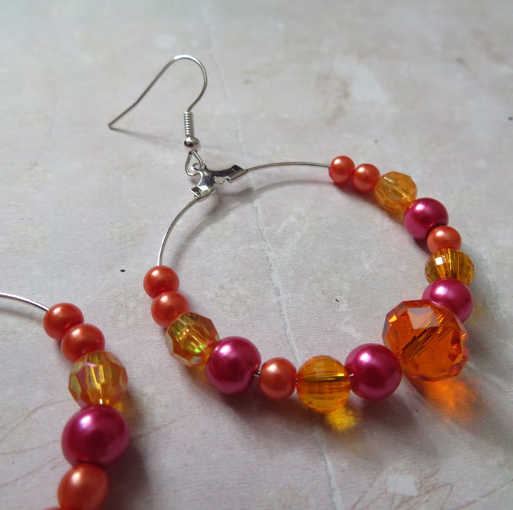 Each hoop is adorned with an artful mix of small dark orange pearls, acrylic orange crystal beads, raspberry pink pearls and a large orange glass rondelle crystal that all blend together to give a sassy bold look.