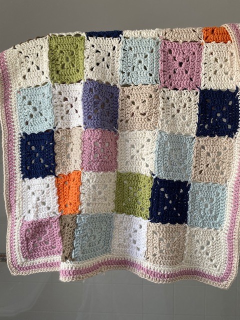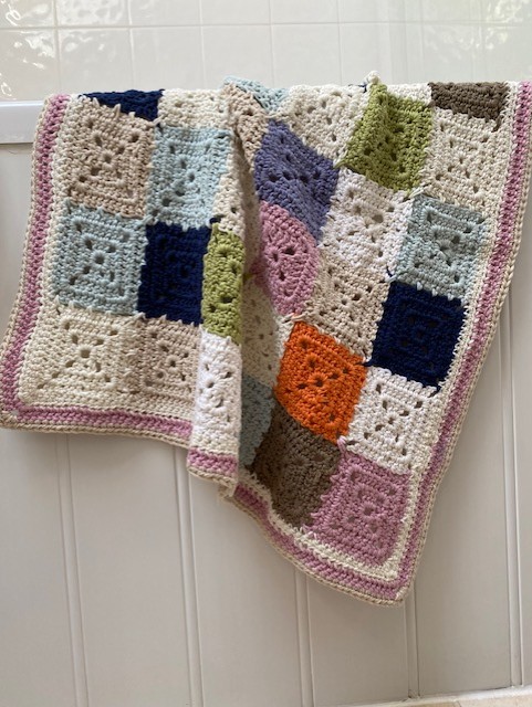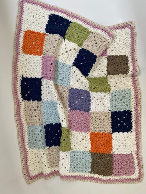 A small soft crochet blanket suitable for a nursery, pushchair, cot. Measuring approx 20" x 23" (51 x 58cm). The yarn is a recycled cotton yarn that can be machine washed. The soft muted colours are suitable for male and female.