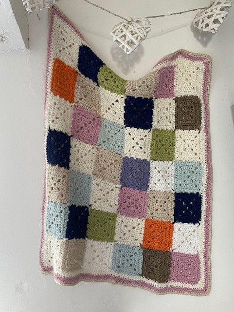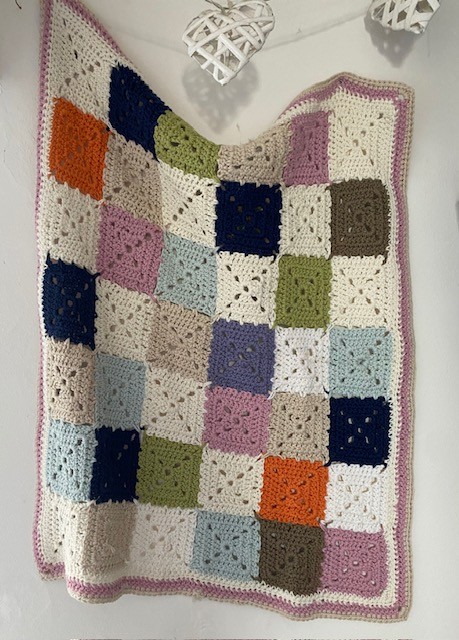 This blanket is made using yarn oddments which gives the blanket a lovely randomness as i had little control over the pattern. The yarn is beautifully soft but practical and cosy and I like the discipline of the square pattern which is a little more closed than the usual granny square.