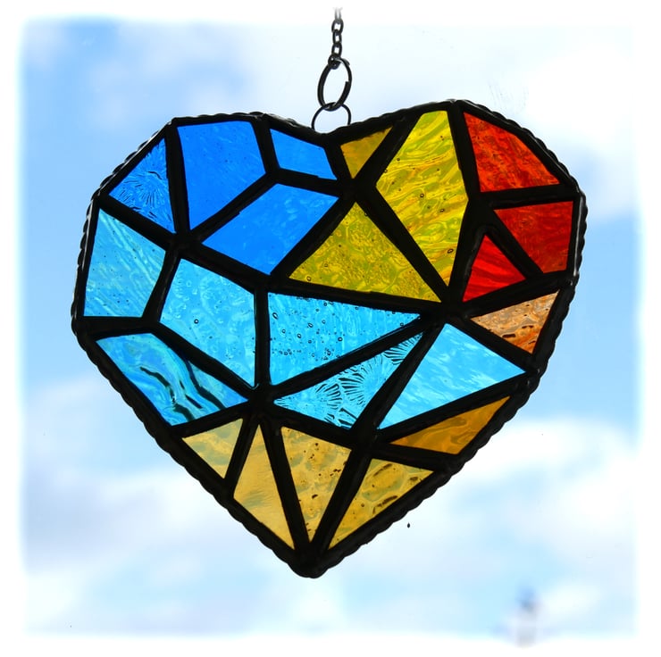 I have designed this with a colour scheme to represent the seaside. A sunset, a blue sky, yellow sun and a turquoise sea over a golden beach. A wonderfully colourful suncatcher which will cast beautiful beams when the light catches it.
