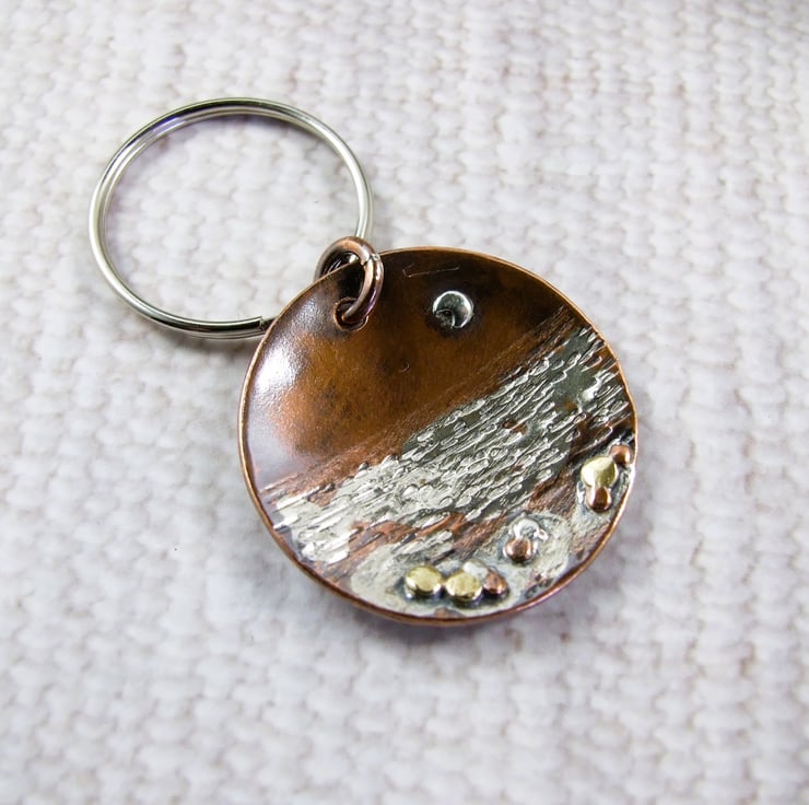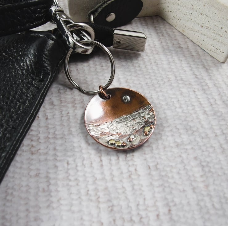 Keyring, copper and sterling silver moonlight seascape. Ideal 7th Wedding Anniversary Gift. Can also be worn as a pendant necklace.