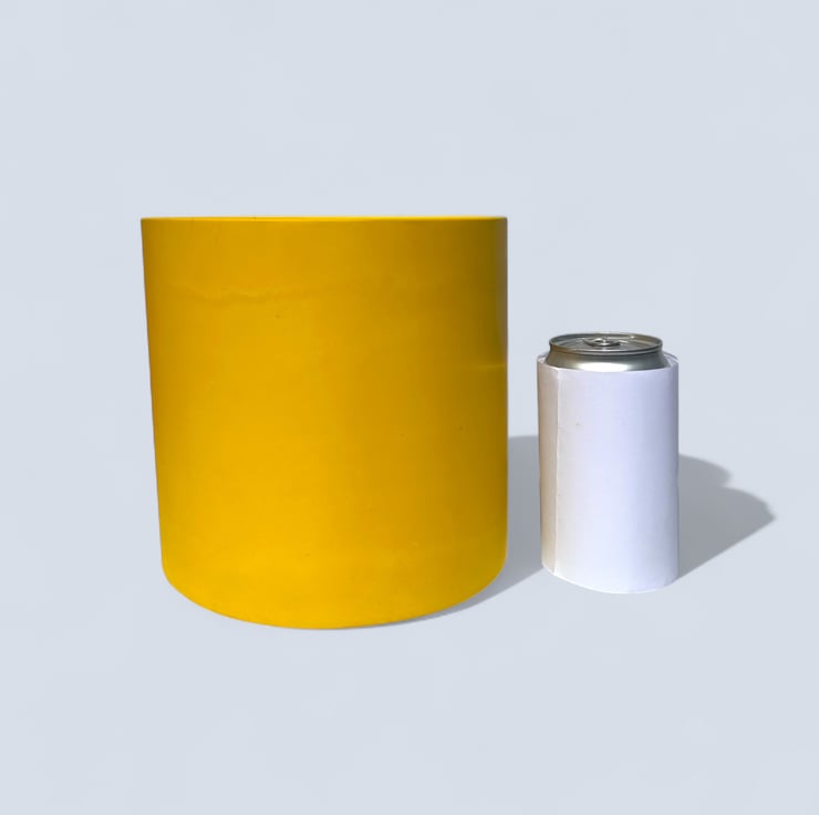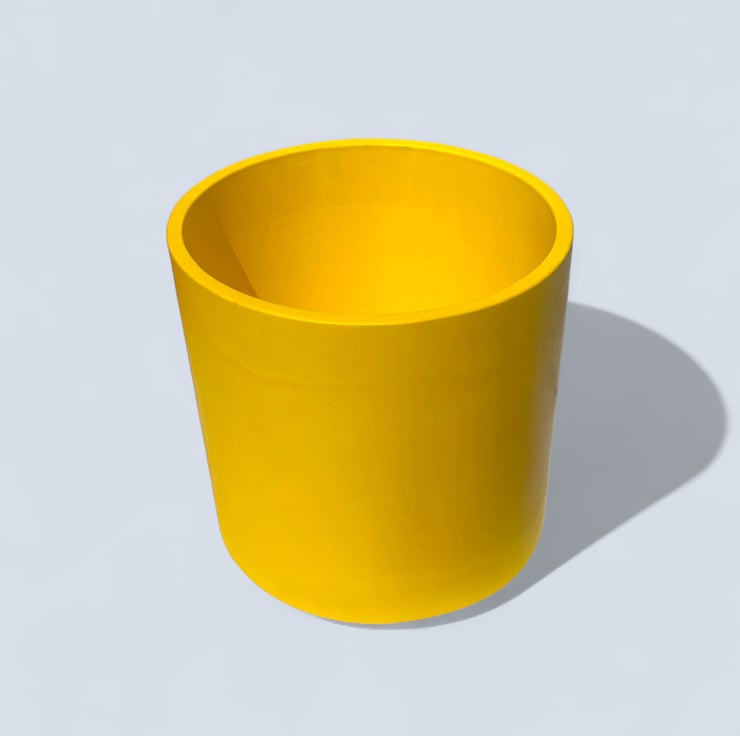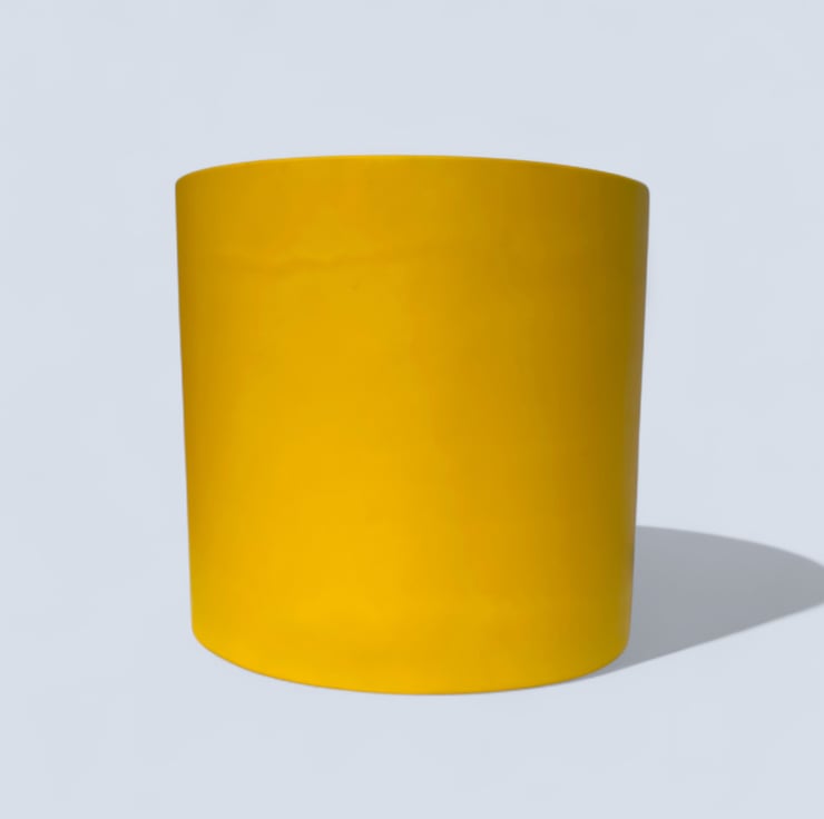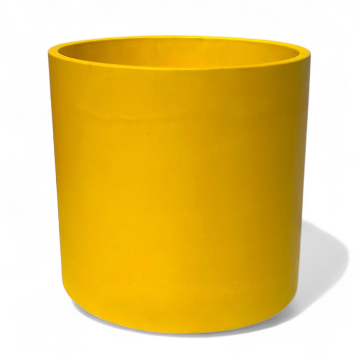 This extra-large handmade cylindrical plant pot is bright sunshine yellow. It is thoughtfully crafted from Cassini, a material commonly used for restoring and repairing marble and stone. Cassini gives the pot a smooth and tactile finish reminiscent of marble while also making it water—and weather-resistant.