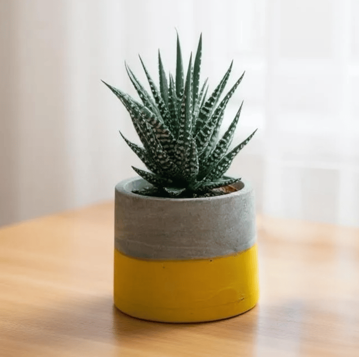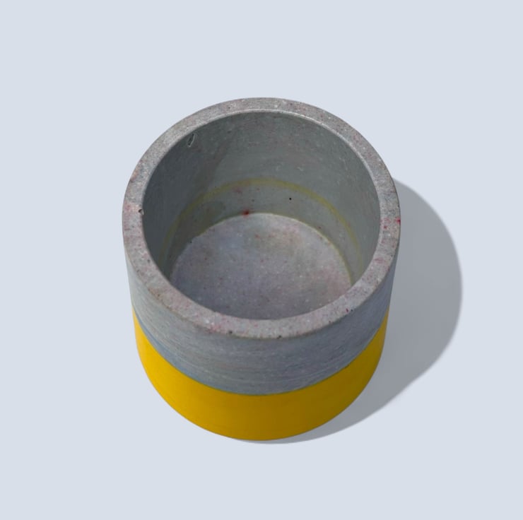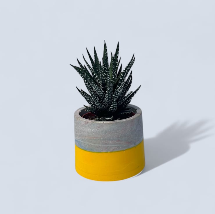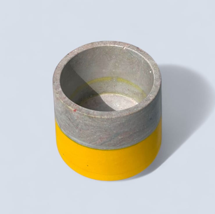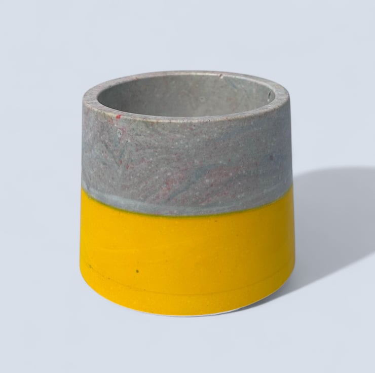 This small, round, two-tone plant pot is a bright sunshine yellow at the bottom, while the top half is a stormy grey. It has a slightly tapered conical shape, with the top narrower than the base. It is handmade from Cassini, a material often used to restore and repair marble and stone. Cassini gives the pot a smooth and tactile finish while also being water-resistant. The pot’s small size makes it perfect to pop on a desk, windowsill or shelf, or anywhere you want to add a pop of colour.
