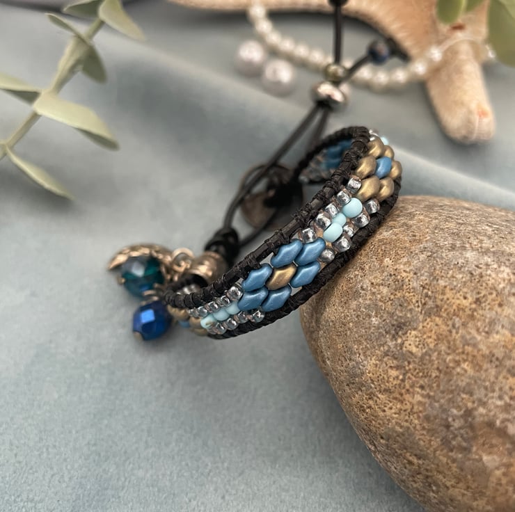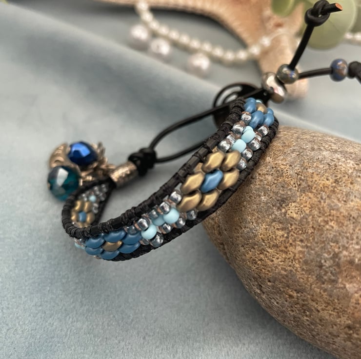 Created by weaving Superduo and Czech seed beads onto Italian leather the closure is a copper colored button and is adjustable by pushing up the sliding bead to fit.