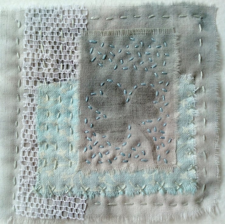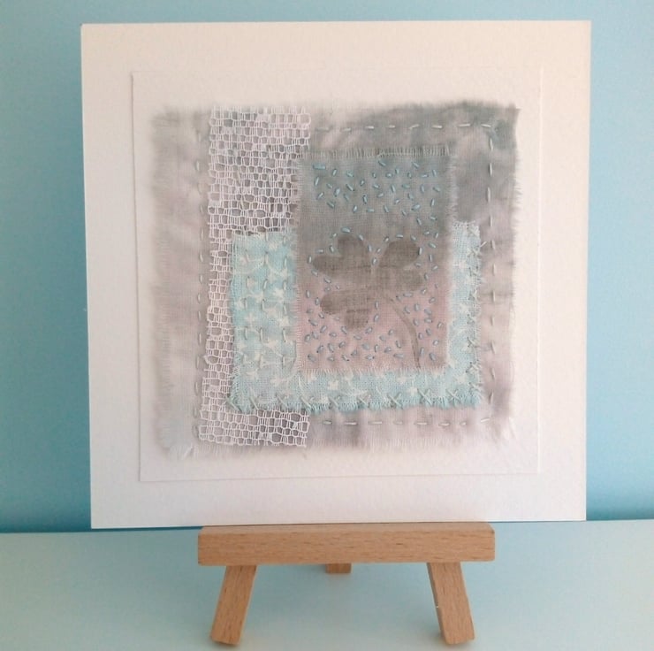 An original piece of mixed media textile art, featuring my own lino printed clover leaf design on an embroidered textile collage.