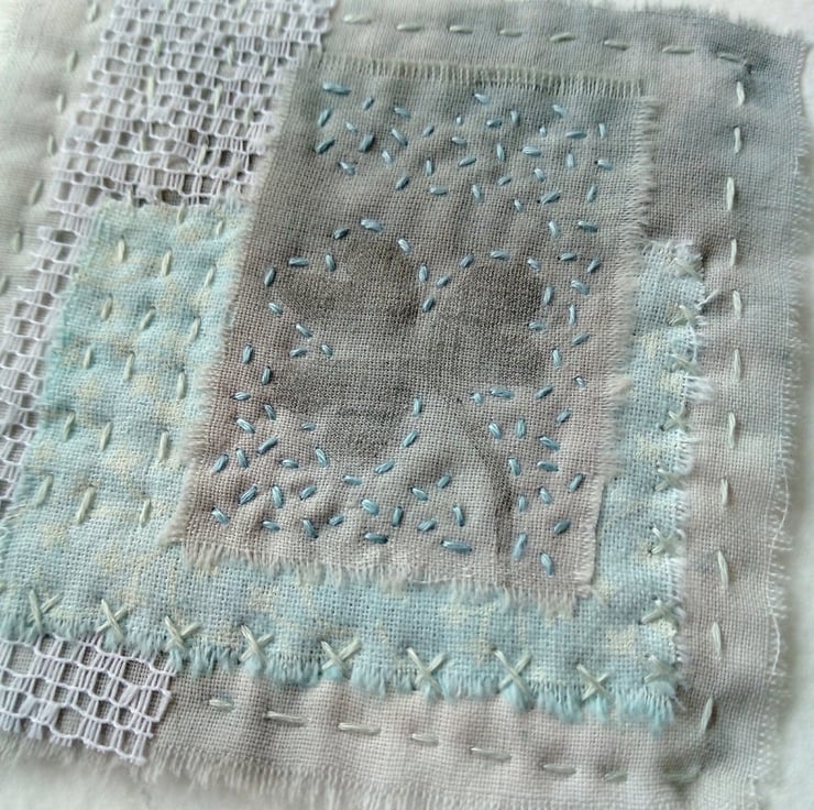 These are placed together, with the clover print design, to create a collage, adding fragments of pre-loved lace netting for added texture.