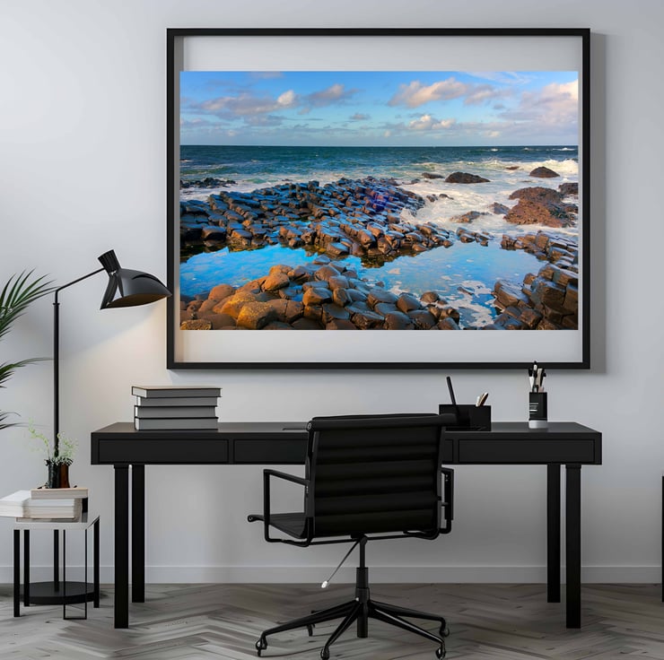 In the foreground, a tranquil pool of water reflects the bright blue sky and scattered white clouds, mirroring the vibrant colours above and contrasting with the darker tones of the wet rocks. The sunlight appears to be hitting the scene from the left, illuminating some of the columns with a warm, golden glow, particularly those closest to the viewer. Beyond the formations, the vast expanse of the sea meets a horizon under a partially cloudy sky. The overall impression is one of rugged natural beauty and geological wonder.