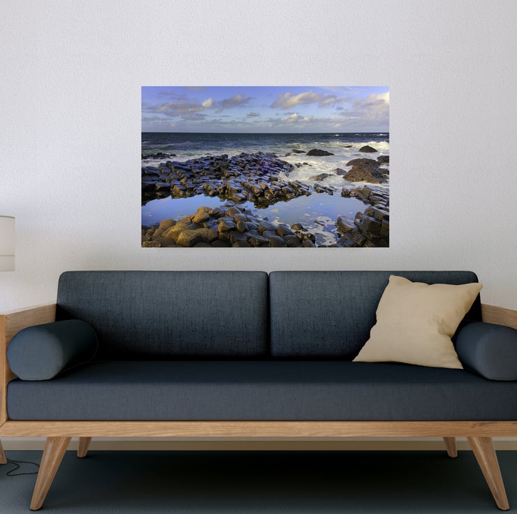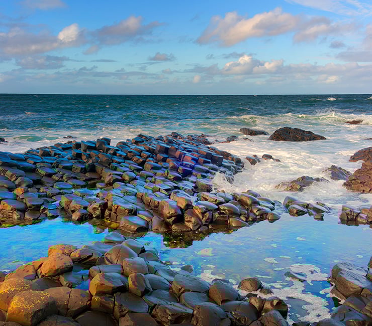 This striking image captures a close-up view of the iconic Giant's Causeway in Northern Ireland, showcasing its unique hexagonal basalt columns. The columns, varying in height and forming natural stepping stones, extend into the turbulent blue-green waters of the Atlantic Ocean, where waves crash against the rocky shore, creating white foam.