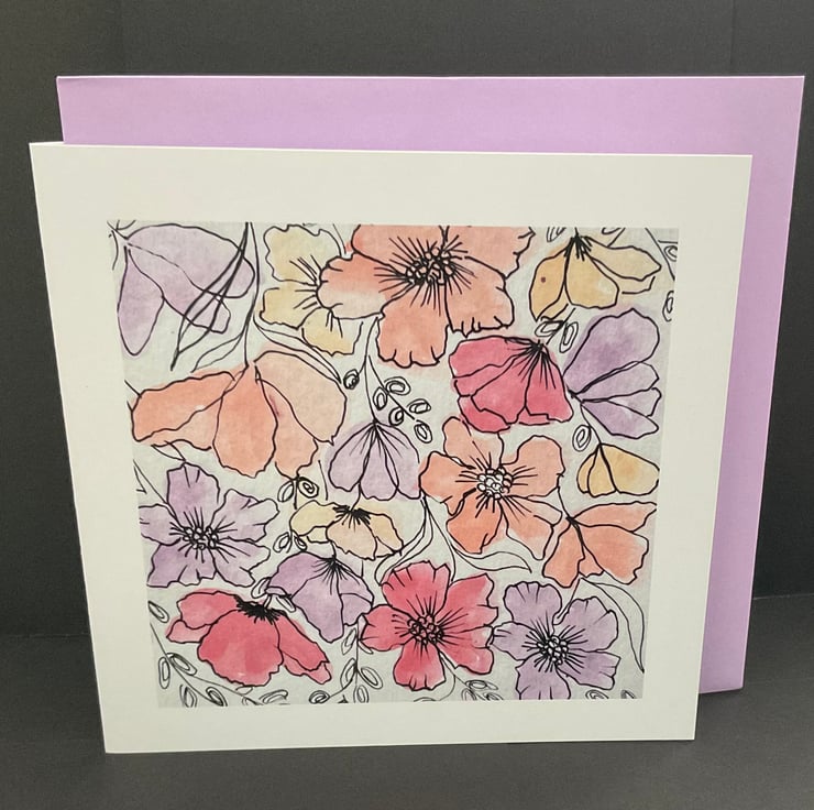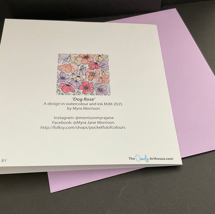 This original design watercolour and ink card ,is blank inside for your own greeting .It features dog rose style blooms ,in various pale colours ,and highlighted with ink.The card would be suitable for a birthday,friend,relative,thank you ,or maybe even a gardener .