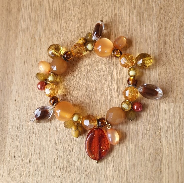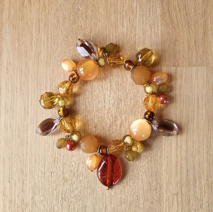 Beautifully hand made beaded bracelet in amber, brown, gold and green colours. It includes round, oval and tear drop beads of various sizes, and with both smooth and faceted finishes.