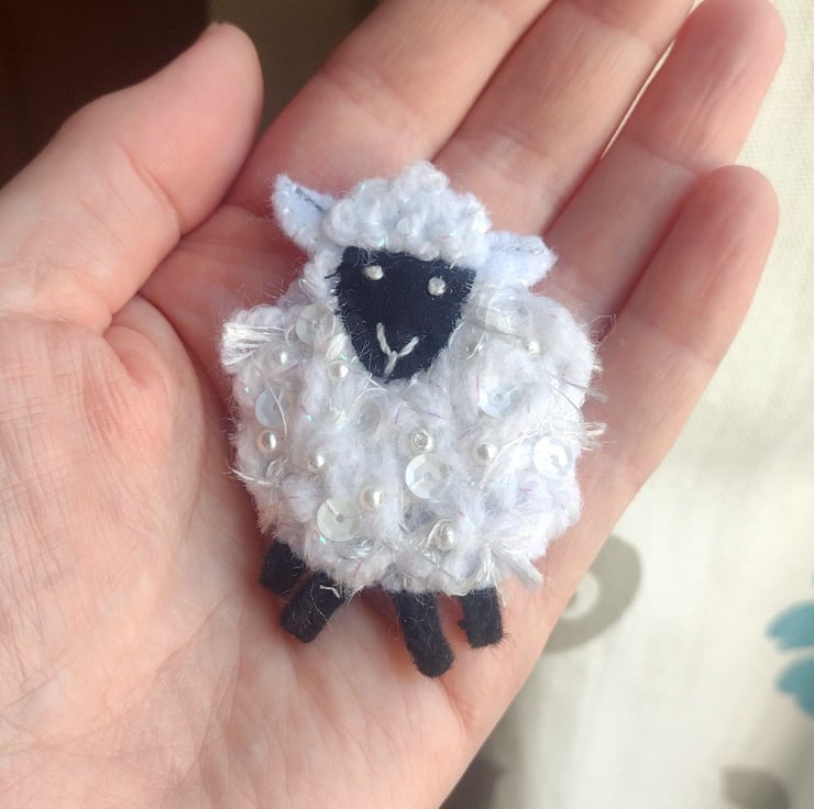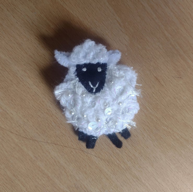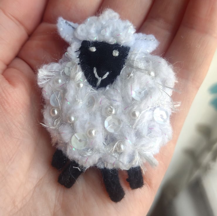 Lovely handmade woolly textured sheep brooch, created from felt, fabric, wool, fibres, beads and sequins, with embroidered facial features.