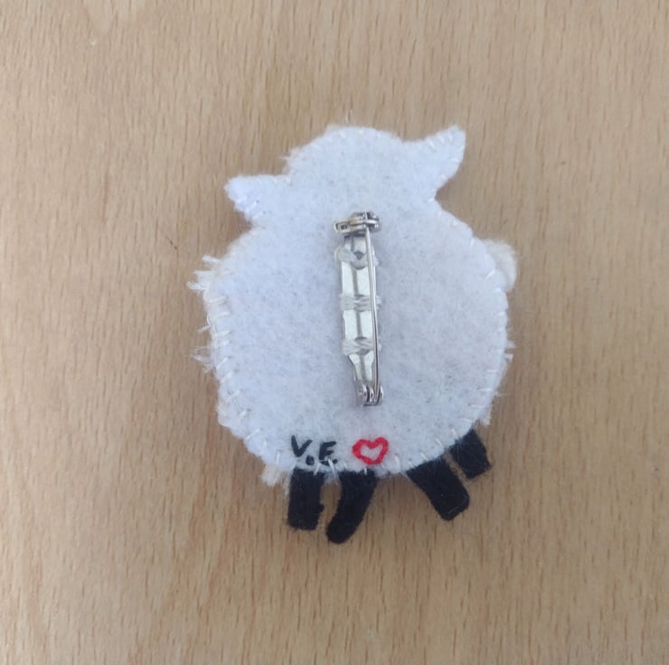 Backed with white felt, embroidered Von Eli initials with small heart and a locking brooch pin.