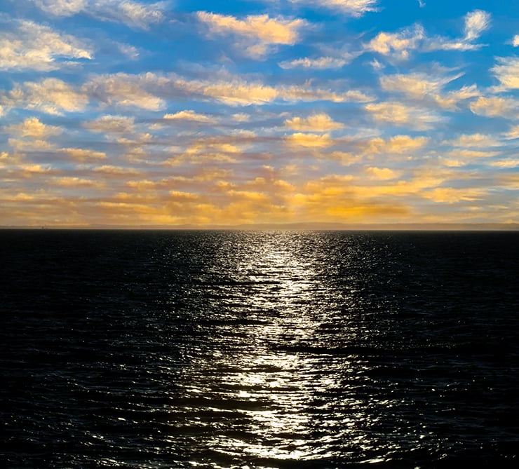 Above the dark waters, the sky is a stunning canvas of colours. The horizon glows with a warm, golden-orange light, hinting at the sun's position just below or at the edge of the frame. Above this warm band, the sky transitions into a vibrant blue, filled with numerous elongated, horizontal clouds. These clouds are beautifully illuminated from below by the golden light, creating a striking contrast between their bright undersides and the cooler blue of the sky. In the distance, a faint, dark landmass or coastline is subtly visible along the horizon line. The overall impression is peaceful beauty and the dramatic interplay of light and shadow at the close of the day.