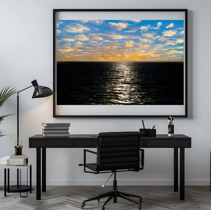 This captivating image presents a serene seascape at sunset looking out from Clevedon towards South Wales, with a prominent sun's path reflecting on the water. The deep, almost black ocean dominates the lower half of the frame, showing gentle ripples and a shimmering, bright silver-gold reflection stretching from the horizon directly towards the viewer.