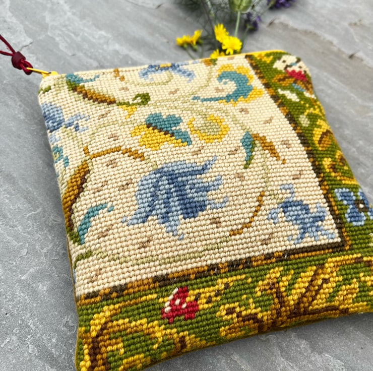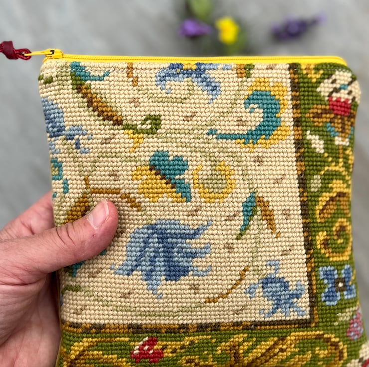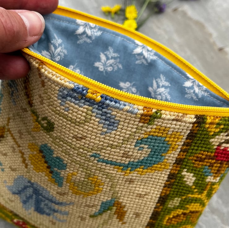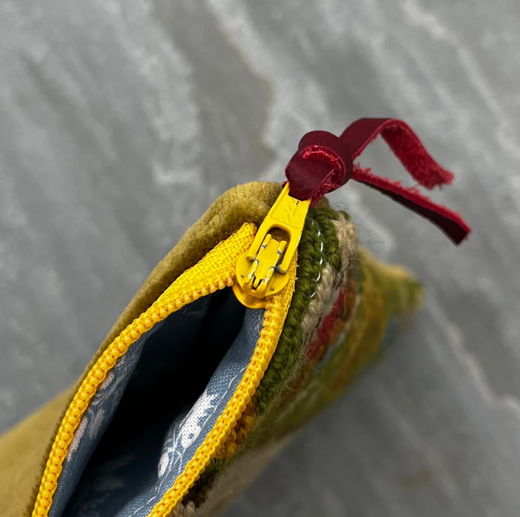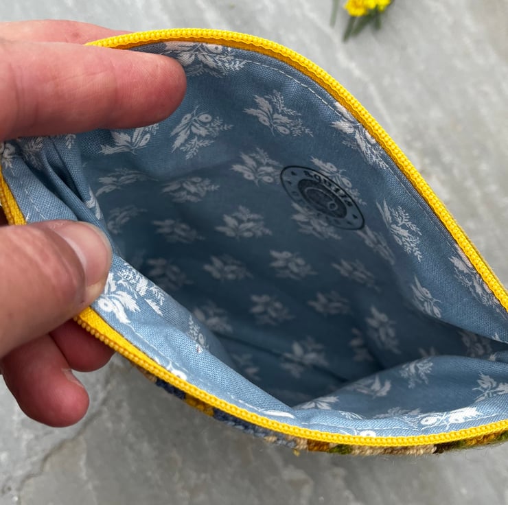 The pouch measures 18cm square. The yellow zip has been reused from the original cushion cover and the paint is slightly worn on the zip pull.