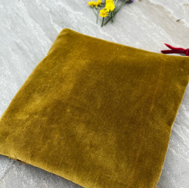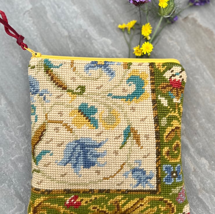 Pretty square zip pouch made from tapestry repurposed from an old cushion cover and soft olive velvet from a curtain. The bag is fully lined with Laura Ashley floral cotton.