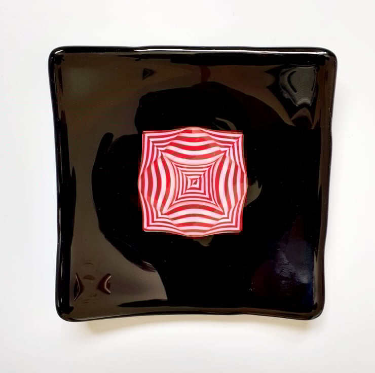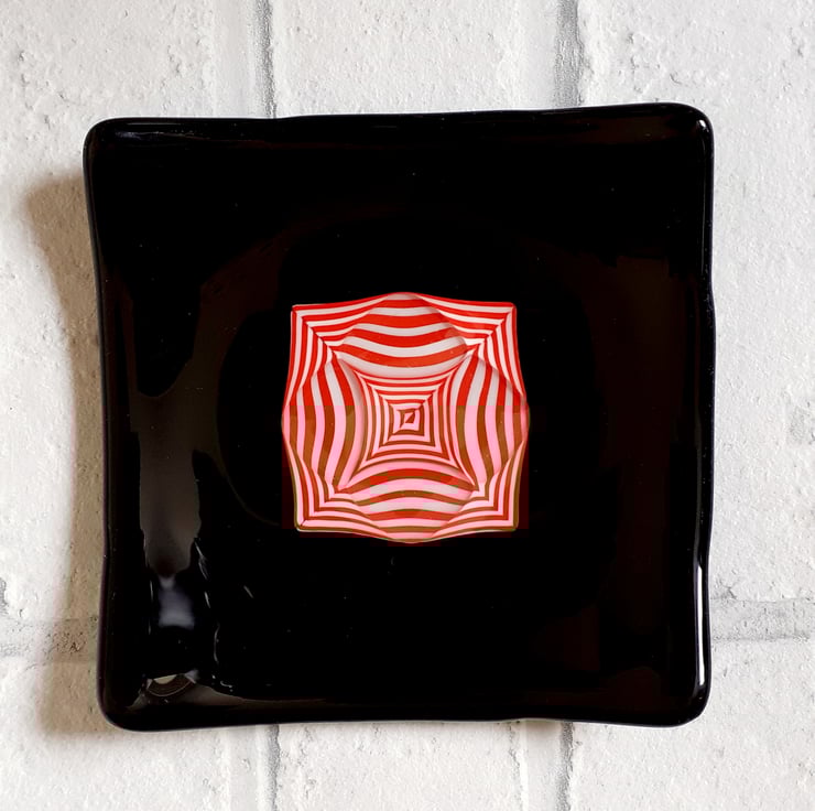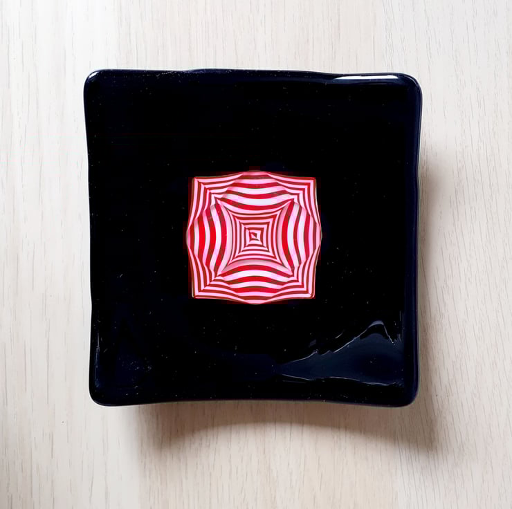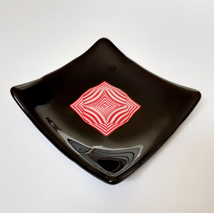 Fused glass decorative dish, in glossy black with a striking red and white pattern, formed by 'tack fusing' thin rods of coloured glass onto a base sheet. Once cool, the sheet is cut into precise triangles which are arranged into a square, then overlaid with triangles of clear glass and surrounded with a border of opaque black glass, and fused again. As the stack of glass softens and flattens during the fusing process, the rods are distorted into this pleasing curved pattern. The resulting flat blank is then kiln-fired for a third time to achieve the dish shape.
