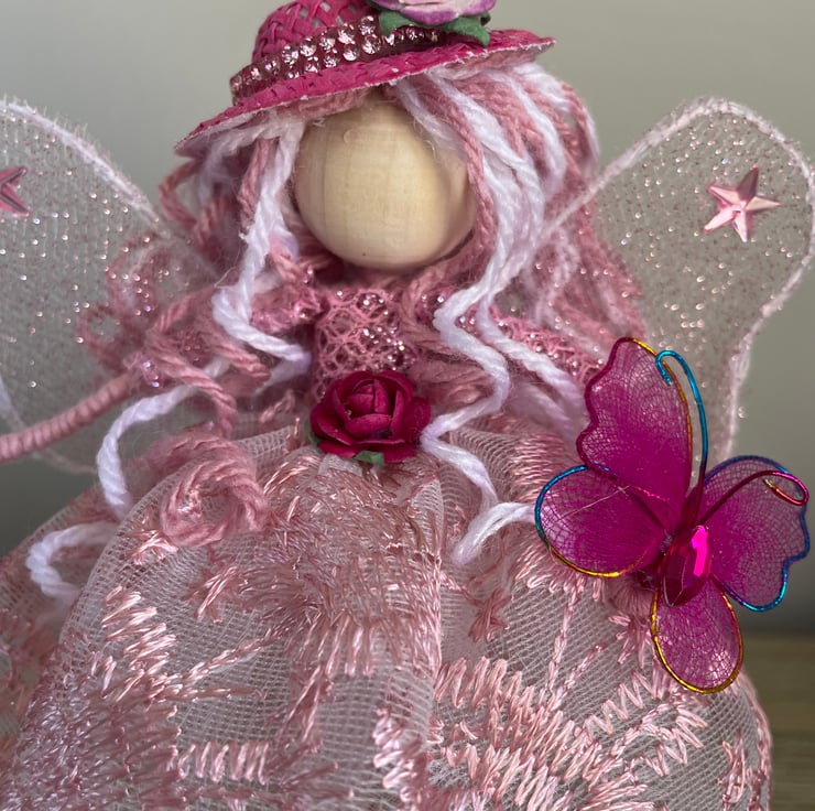 Rose wears a beautiful handmade lace dress with a Pink bodice, complete with organza underskirts. Her lovely Pink highlighted hair hangs in waves under a pretty straw hat adorned with a pink rose . In one hand she holds her magic fairy star wand and in the other sits a pretty butterfly. Her organza sparkly wings are handmade.
