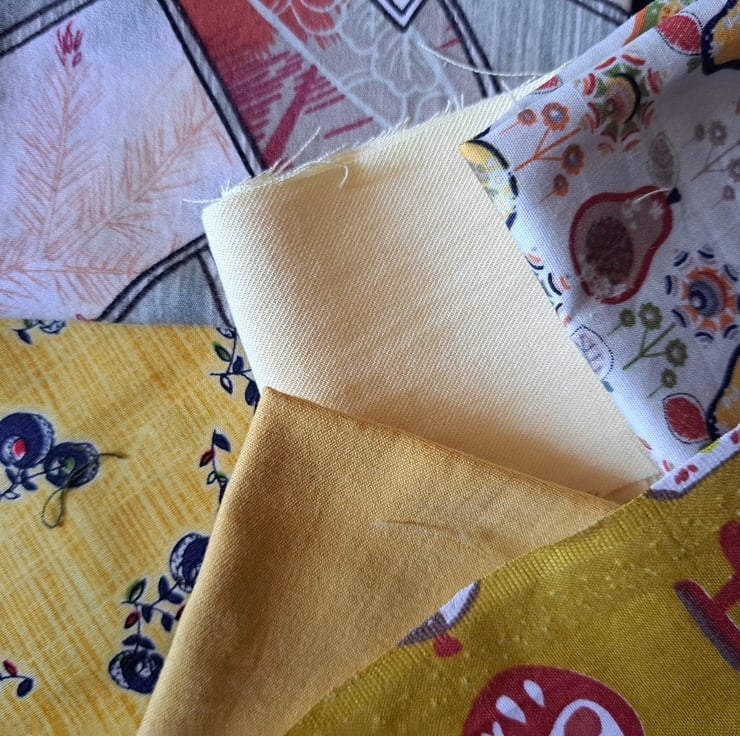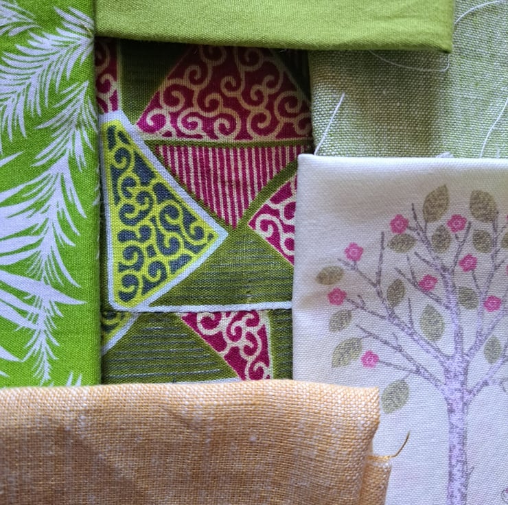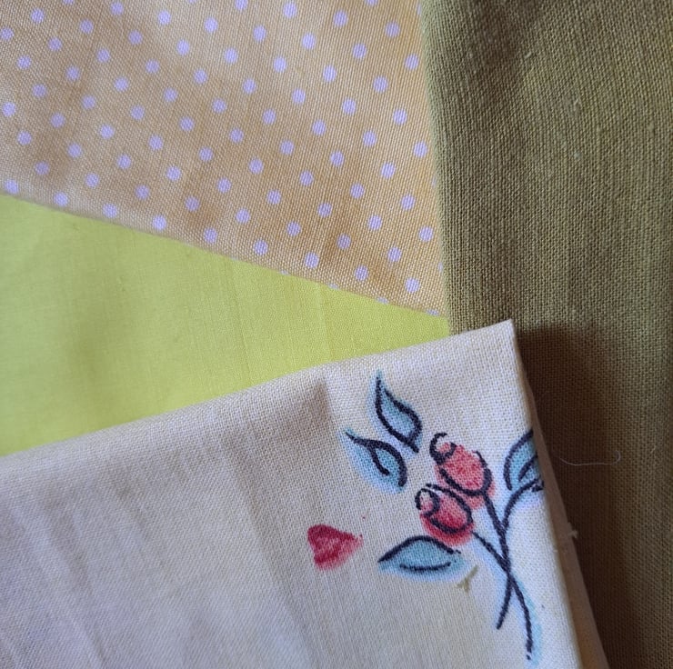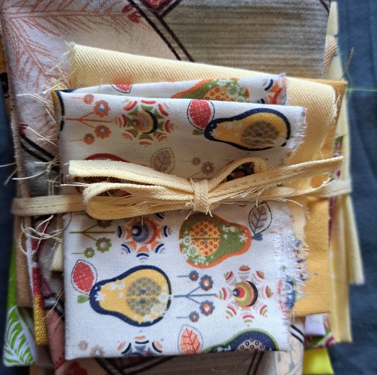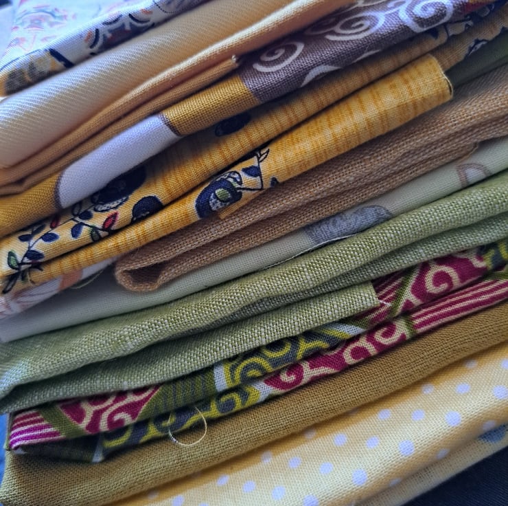 A flavourful bundle of 16 pieces of cotton and linen fabric (one polycotton, I think), in yellows and greens. New, rescued and repurposed, and ready to add a splash of fresh colour to your next project.