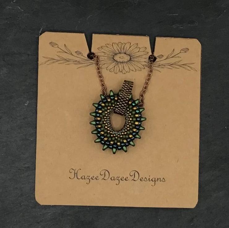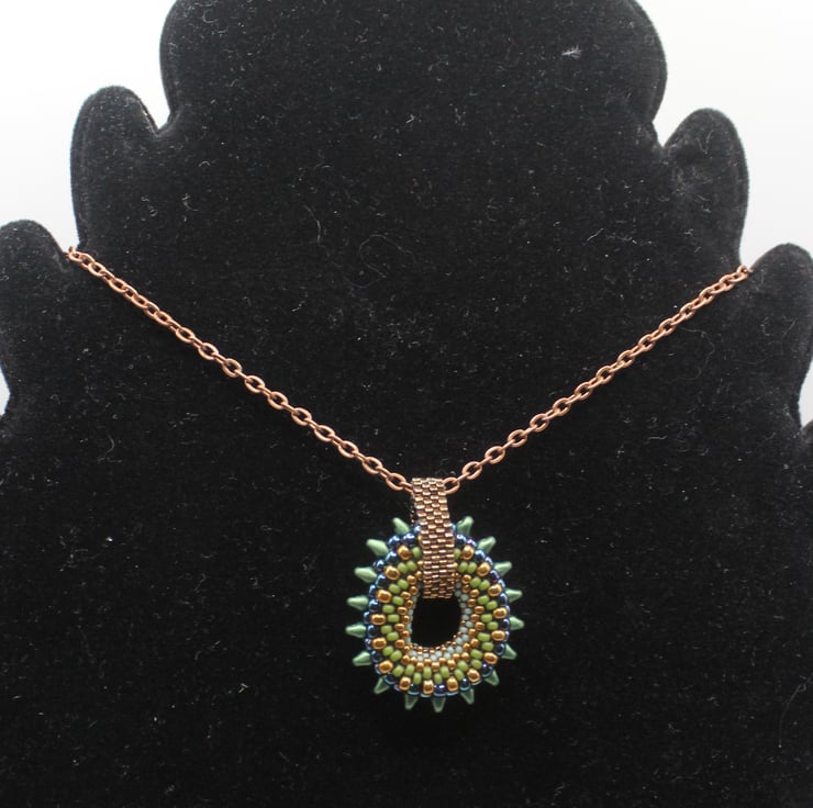 An unusual beaded pendant in the shape of an egg shaped donut with spiky details. This pendant features blue, green,and copper japanese seed beads and many hours of work. It is a versatile piece of jewellery which will coordinate with many outfits. It measures approx. 4 x 3 cms and comes with a copper coloured chain measuring approx.51cm with an additional 5cm extension.