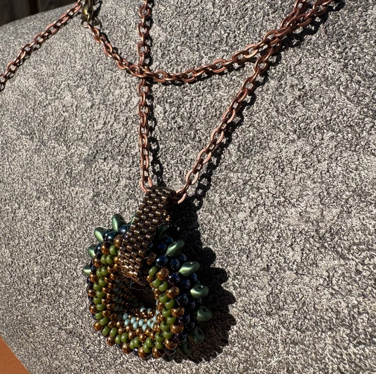 This is an unusual piece of jewellery.I loved the challenge of the intricate pattern and how beads can be manipulated into a 3d design. The copper, green and rich iridescent blue compliment each other very well.