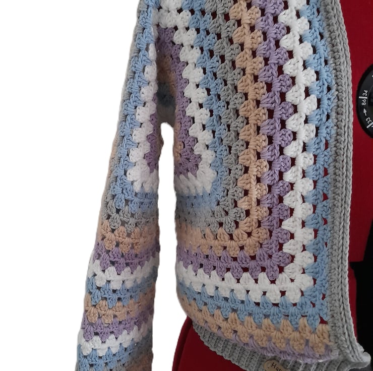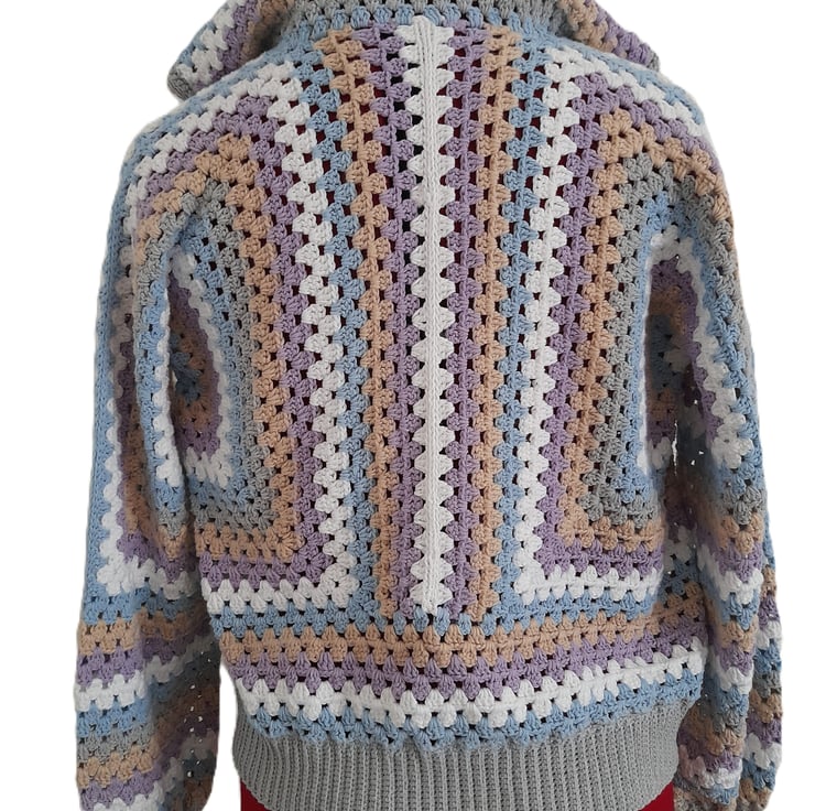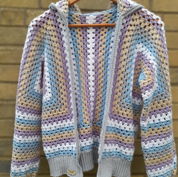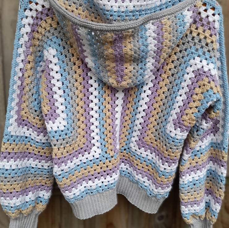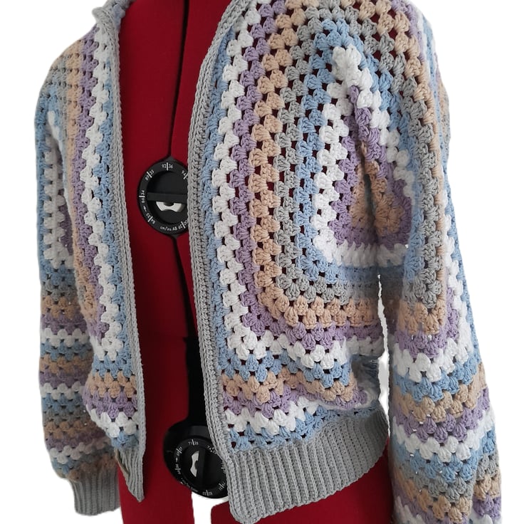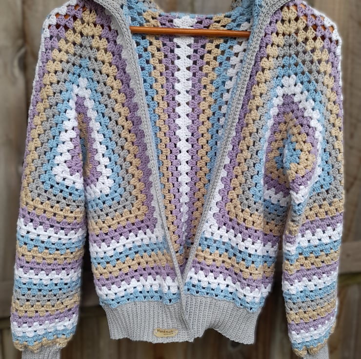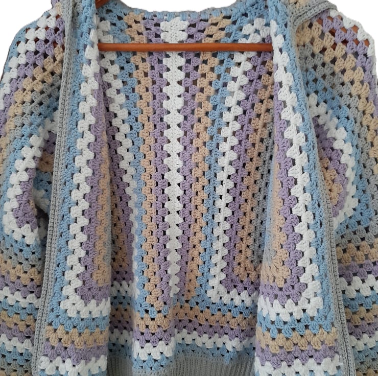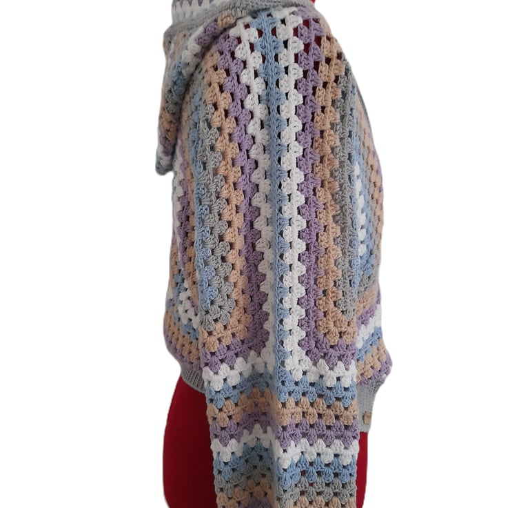 I crocheted this open-front cardigan with a cosy hood from 100% cotton. The soft pastel shades of purple, blue, white and beige are beautifully complemented by a modern grey border and cuffs.