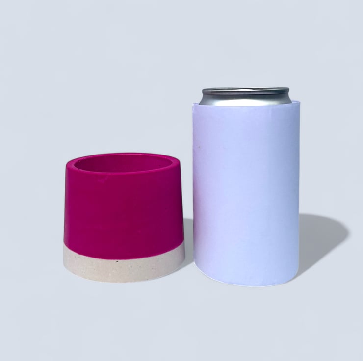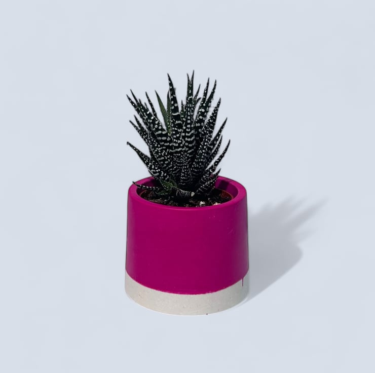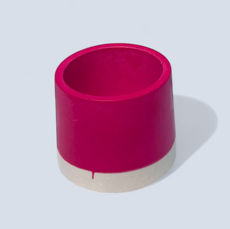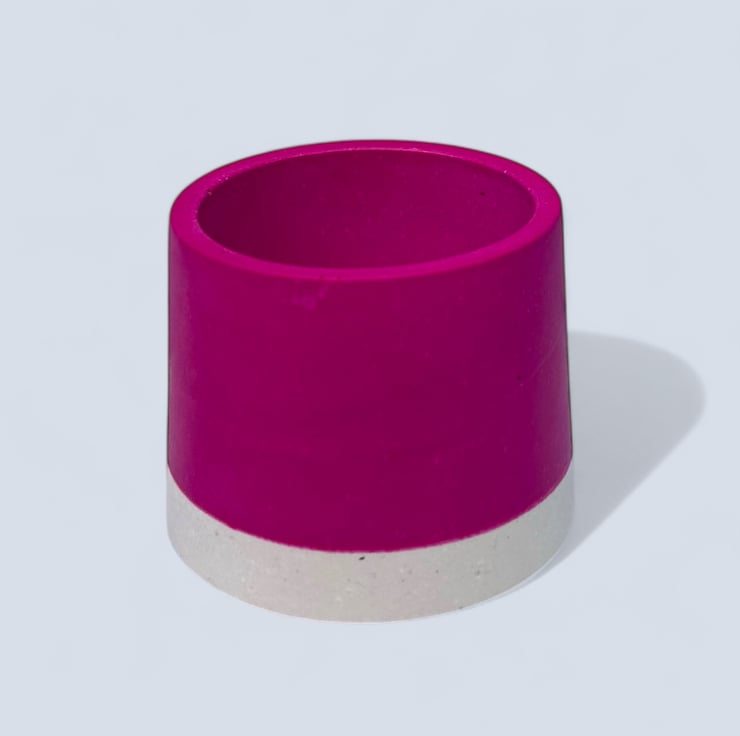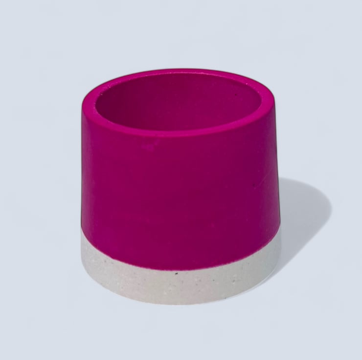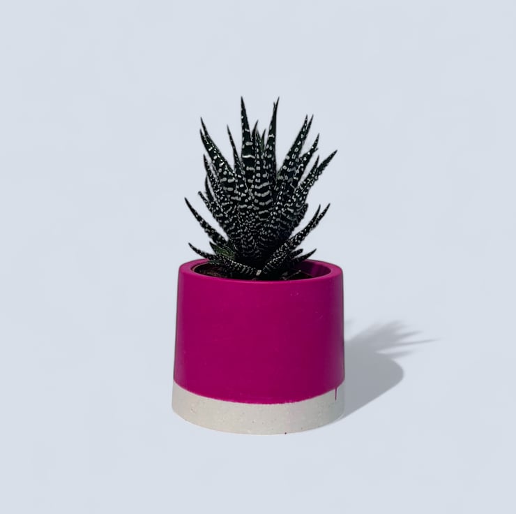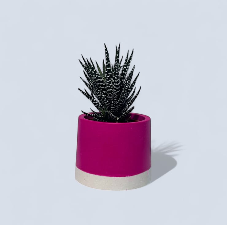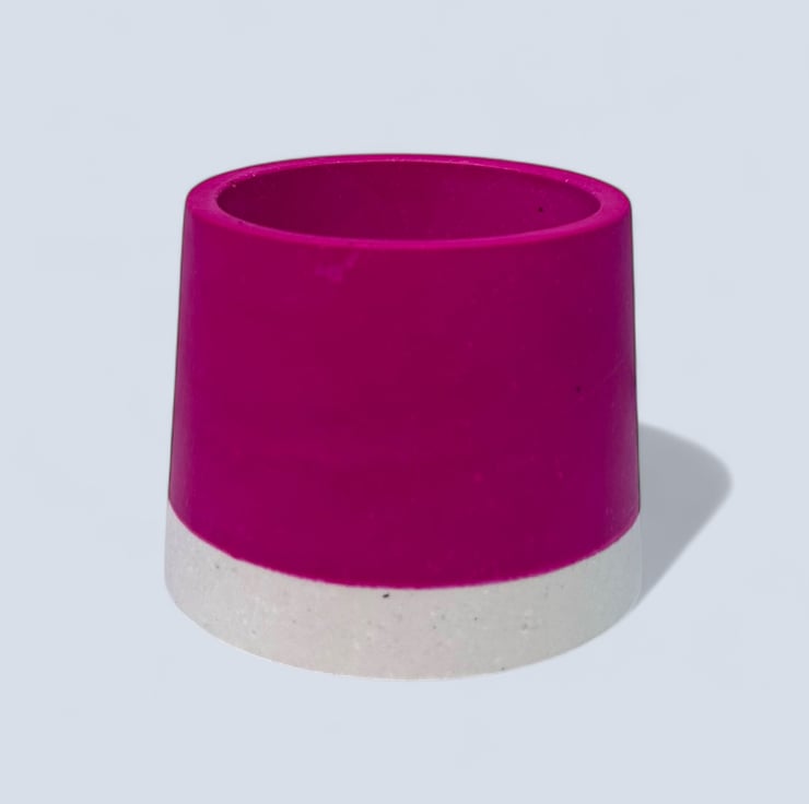 This small, round, two-tone plant pot is a vibrant magenta mostly, but has a white stripe that runs around the bottom. It has a slightly tapered conical shape, with the top narrower than the base. It is handmade from Cassini, a material often used to restore and repair marble and stone. Cassini gives the pot a smooth and tactile finish while also being water-resistant. The pot’s small size makes it perfect to pop on a desk, windowsill or shelf, or anywhere you want to add a pop of colour.