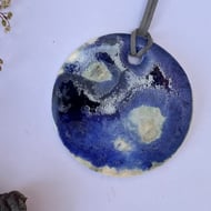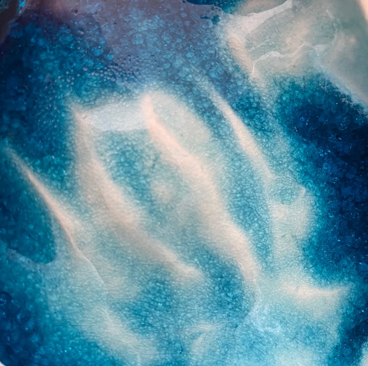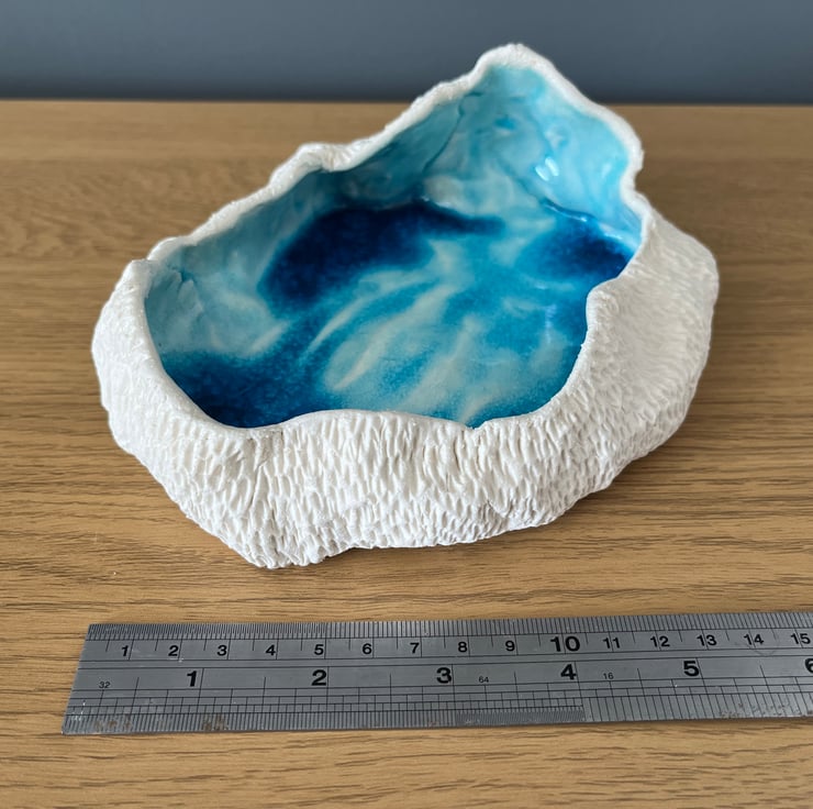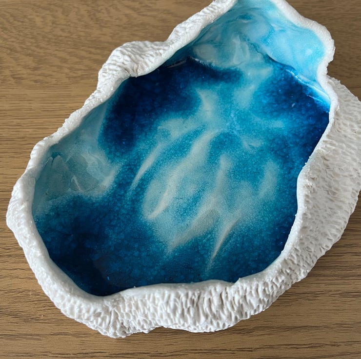 Inspired by the Geode this piece is hand formed and carved from white stoneware and filled with my signature sapphire crackle glaze.