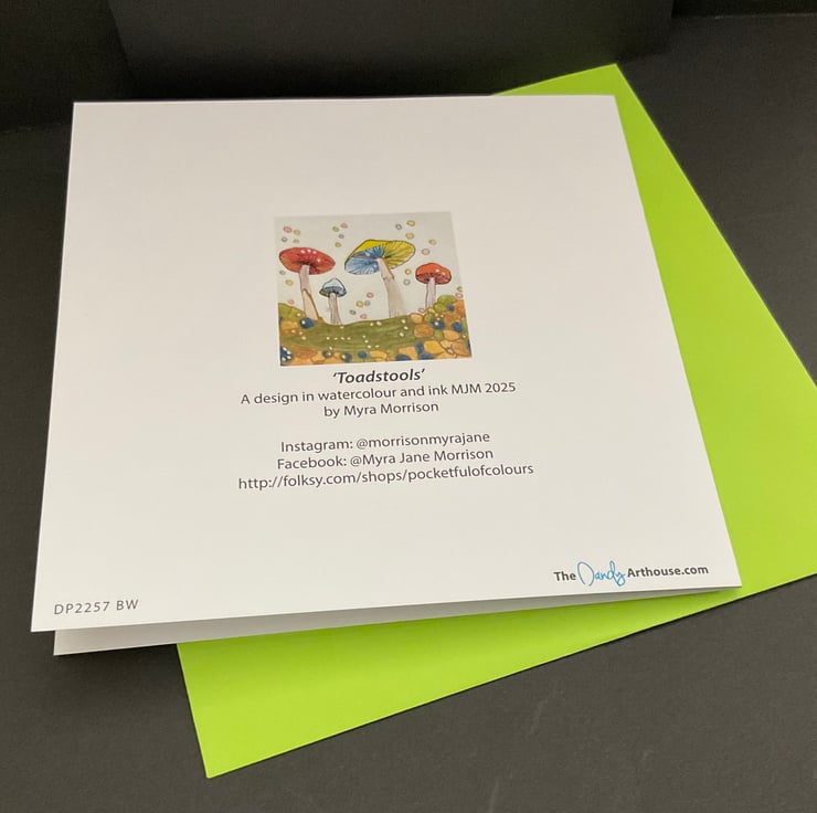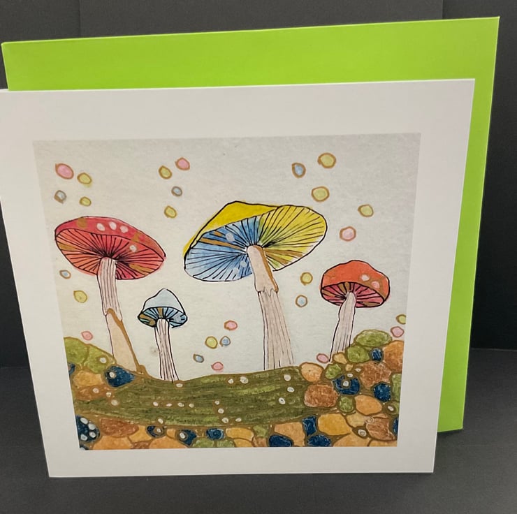 This is a design in watercolour and ink,The card is blank inside for your own greeting .It features a modern design featuring toadstools The card would be suitable for a birthday,friend,relative, as a thank you .
