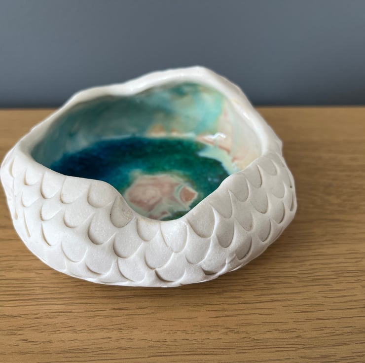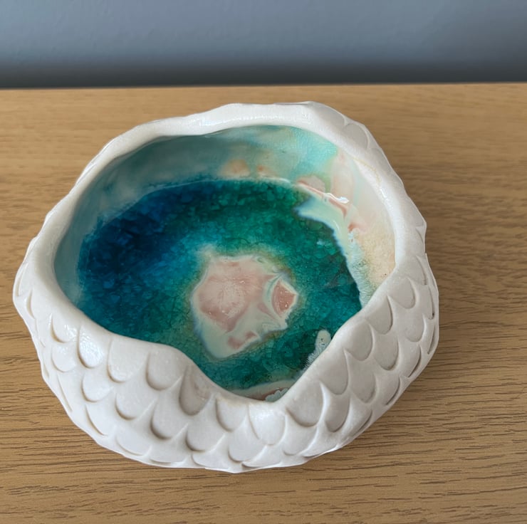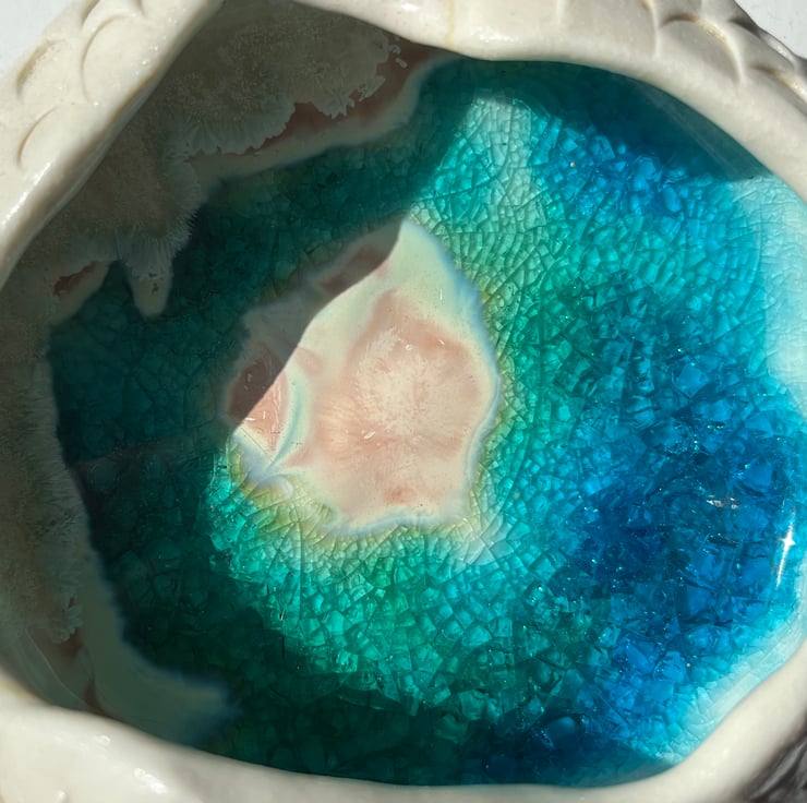 Inspired by the Geode this piece is hand formed and carved from porcelain and filled with my signature emerald and sapphire crackle and crystalline glaze.