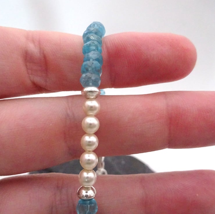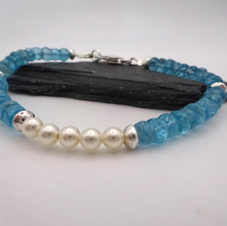 A beaded bracelet which features Ocean Apatite gemstone beads, sterling silver disc beads and pearl beads.