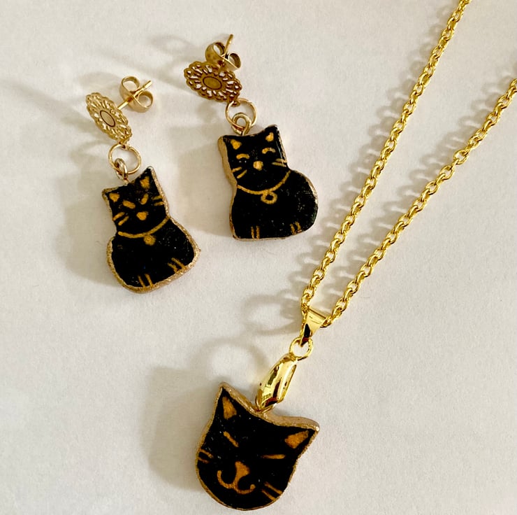 A super cute pair of tiny lucky black cat earrings and matching black cat face pendant entirely handcrafted in air dry clay.