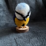 It stands on a log slice, with wire feet, glass eyes and clay beak.