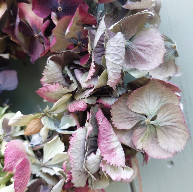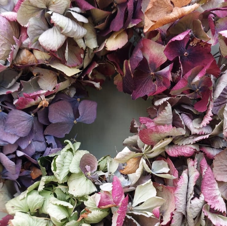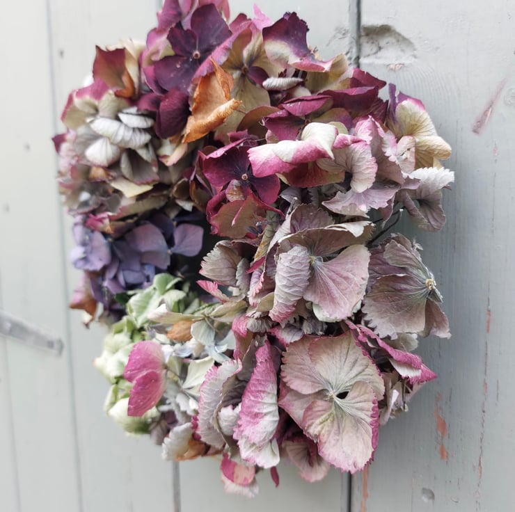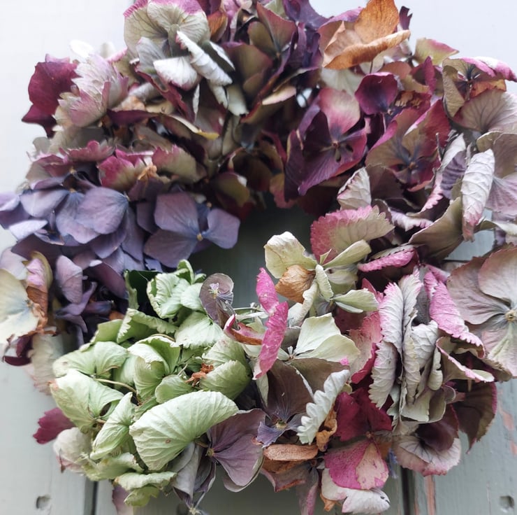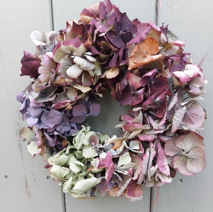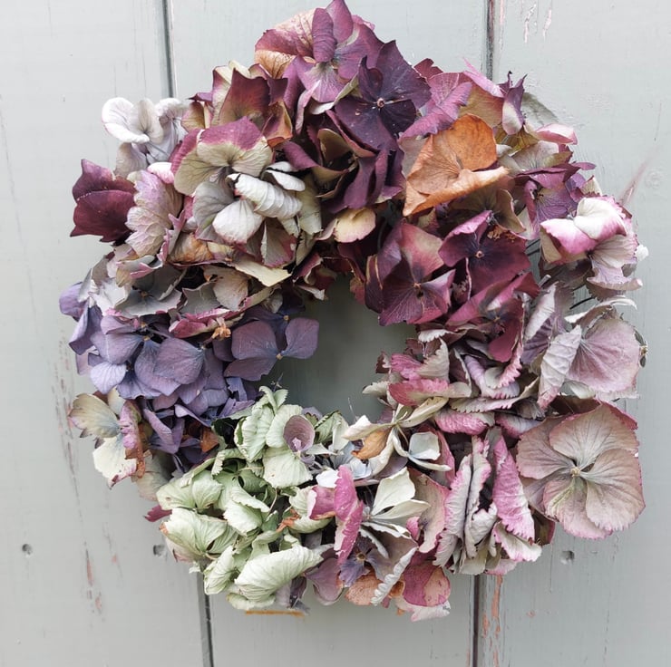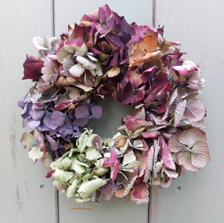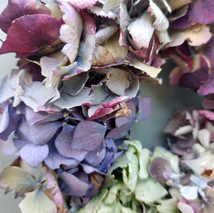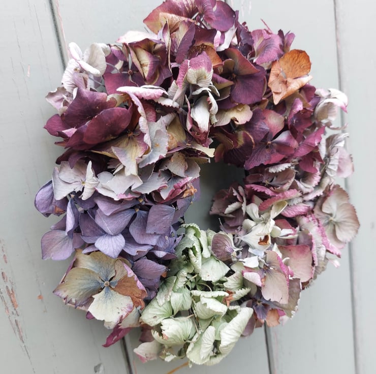 A handmade dried hydrangea wreath measuring approximately 17cm in diameter in shades of purple, blue and green.