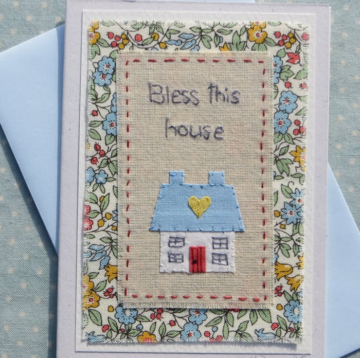 A handmade greeting card featuring a hand-stitched miniature applique house with stitched wording, backed with a beautiful Liberty cotton fabric. Perfect way to send your love and best wishes to anyone moving to a new home. (would look lovely framed too!).