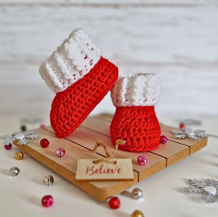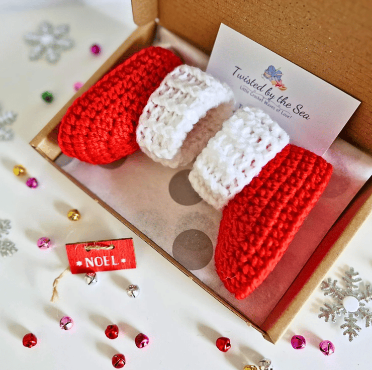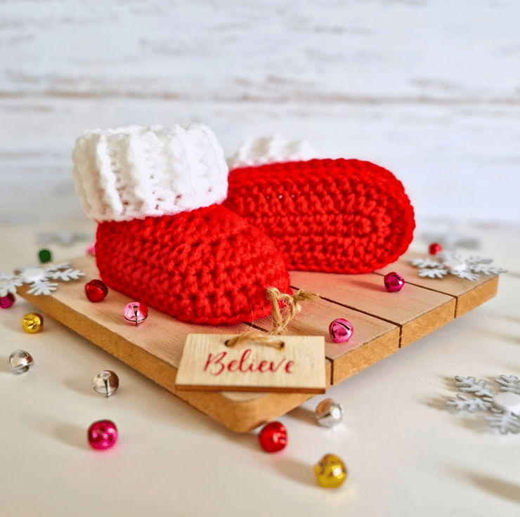 Celebrate baby’s first Christmas with these festive handmade crochet booties in traditional red and white. Designed to keep little toes warm and cosy, they make a perfect seasonal gift, stocking filler or keepsake for new parents. Carefully crafted in one seamless piece, these booties are soft, stretchy and comfortable for delicate newborn feet.