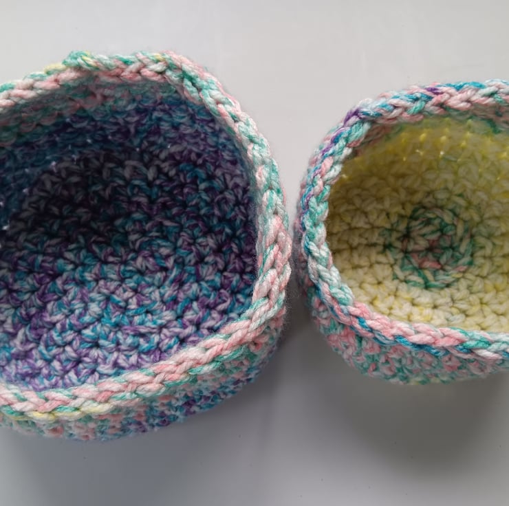 NEW SHOP! I love crocheting and creating beautiful and practical pieces and sourcing good quality yarns. These nesting baskets are made from a luxury variegated yarn. I have sets in my bedroom to hold toiletries, makeup and trinkets, in my home office to hold pens and stationery and in my kitchen to hold all the bits and bobs that gather there. Enjoy unique work by Handmade by Joy - browse my shop for more, new items added regularly! BONUS - free postage!