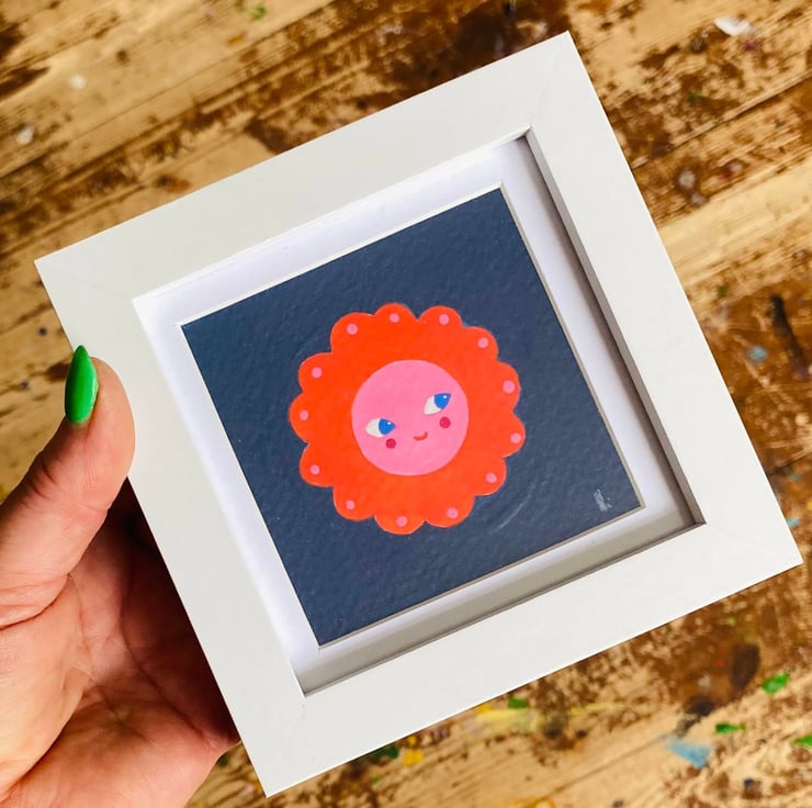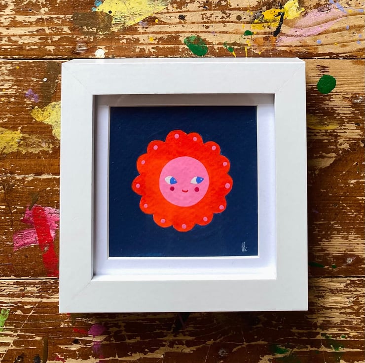 Sweet little illustration finished in Holbein Gouache, measuring 7.5 x 7.5 cm set in a simple white 10 x 10 cm frame, ready to pop straight in to your wall!