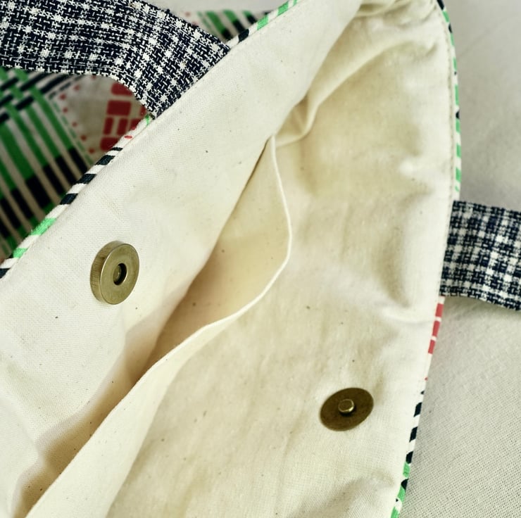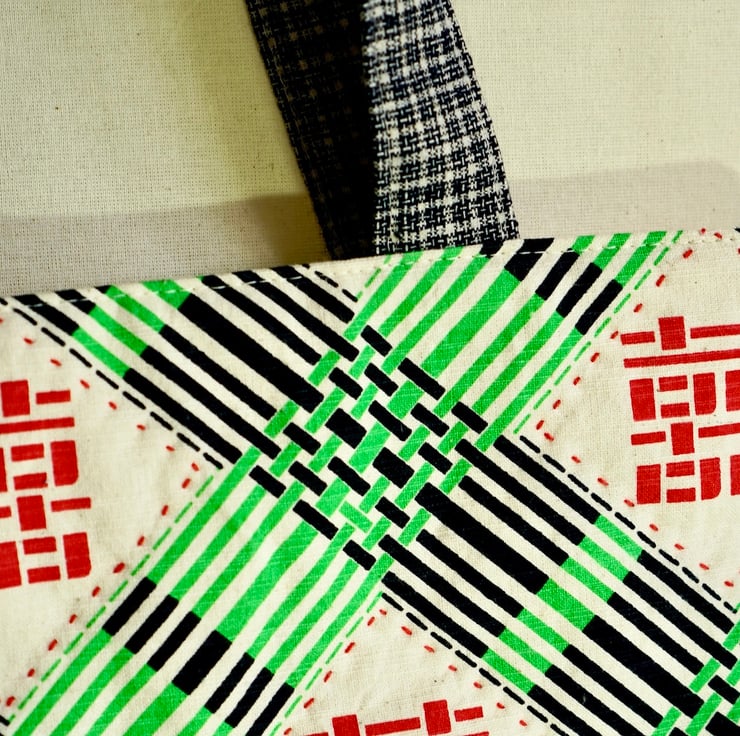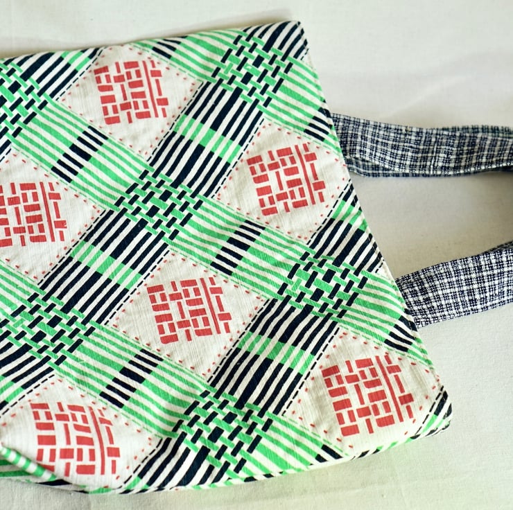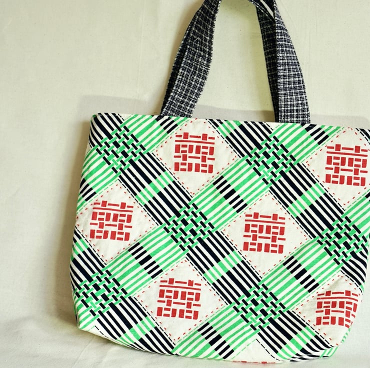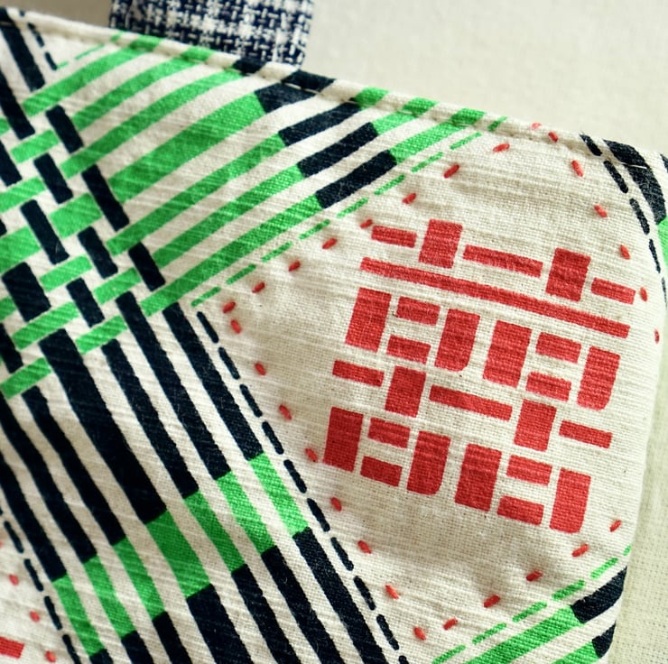 A joyful statement piece made from handwoven cotton and hand-printed with the traditional Double Happiness symbol — a meaningful Chinese motif symbolising love, unity, and good fortune. The bright colour tones and tactile textures give this tote its rich, storied charm. Decorated with hand stitches and finished with vintage fabric handles in a contrasting colour for extra character.