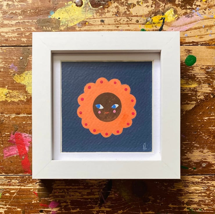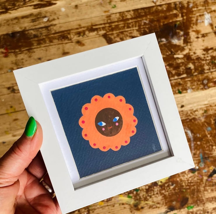 Sweet little illustration finished in Holbein Gouache, measuring 7.5 x 7.5 cm set in a simple white 10 x 10 cm frame, ready to pop straight in to your wall!