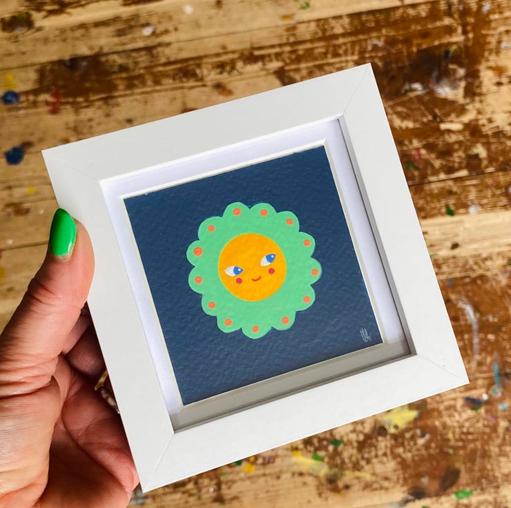 Sweet little illustration finished in Holbein Gouache, measuring 7.5 x 7.5 cm set in a simple white 10 x 10 cm frame, ready to pop straight in to your wall!