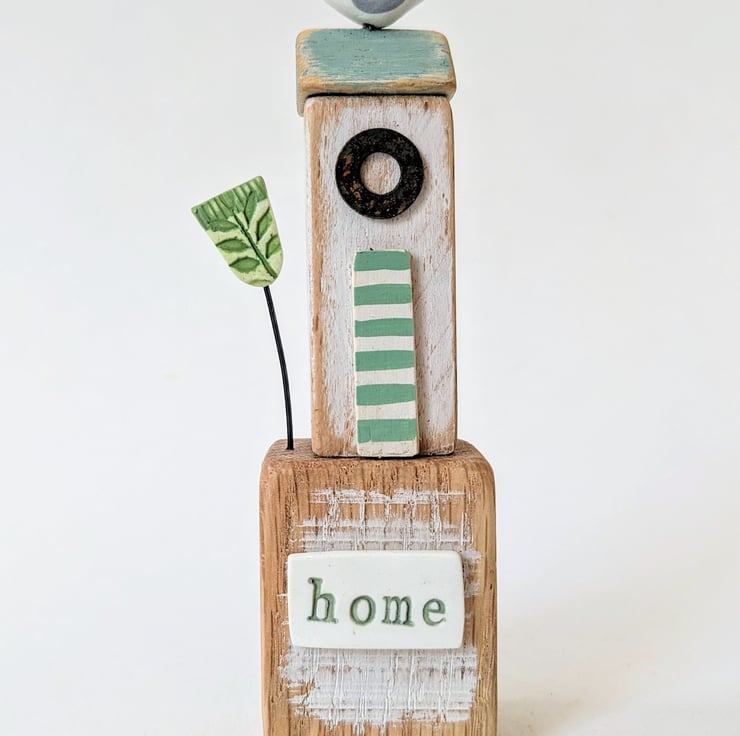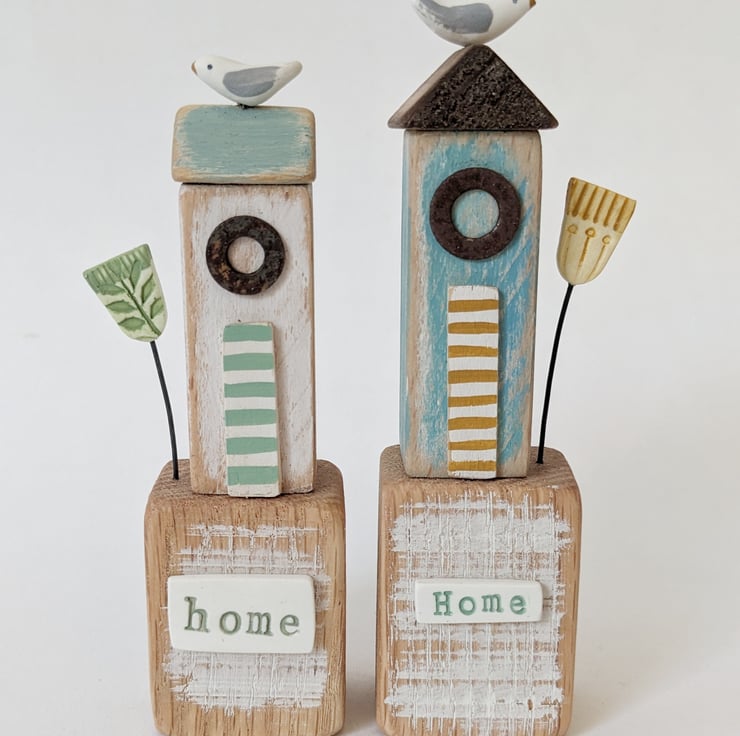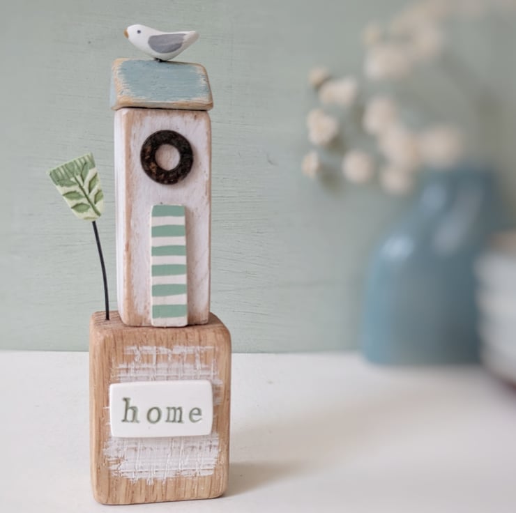 This is one of my tiny little rustic sea huts with a porthole window, a happy flower, and a hand stamped base.